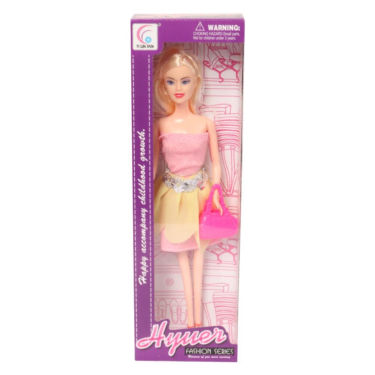 Lalka w różowej bluzce i żółtej spódnicy z różową torebką