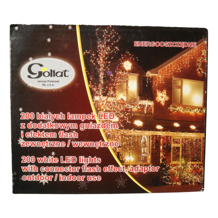 Lampki Choinkowe Zewnętrzne 200 LED z Efektem Flash i Dodatkowym Gniazdem, Białe, Zasilanie Sieciowe, Przepalenie Jednej Diod nie Wygasza Zestawu