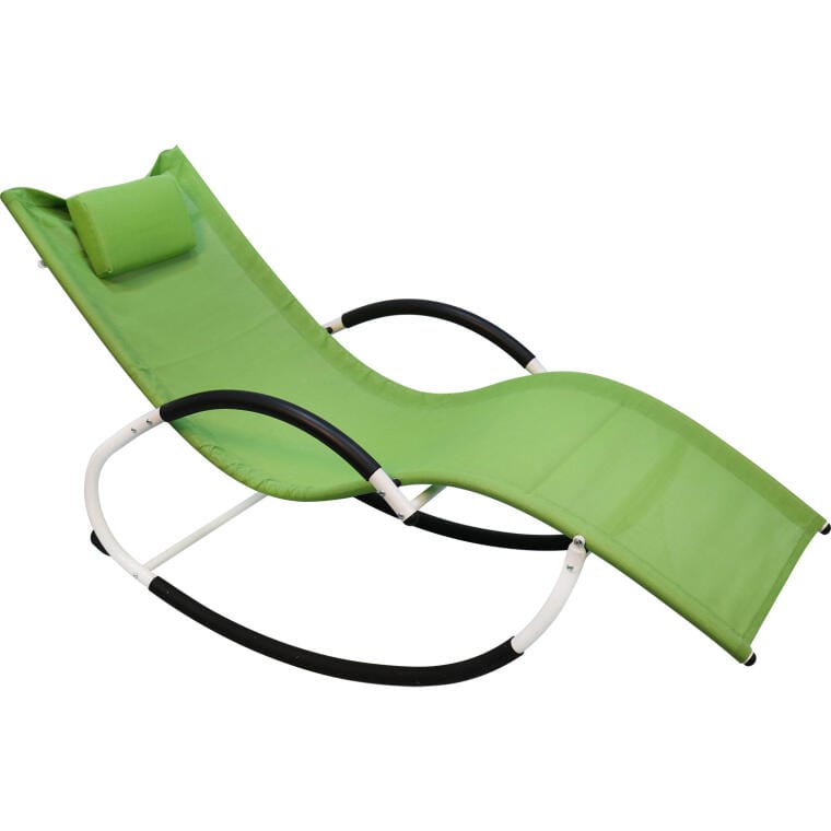 Wygodna leżanka ogrodowa pozwoli na odprężenie na świeżym powietrzu w ciepłe dni. Wygodne, materiałowe siedzisko ma naszytą poduszkę pod głowę, co podnosi komfort korzystania z mebla. Leżanka jest także bujana i jest idealnym miejscem na popołudniową drzemkę. Szczegóły: Kolor: ZIELONY Wysokość całkowita 80 cm szerokość całkowita 64 cm Długość całkowita 163 cm