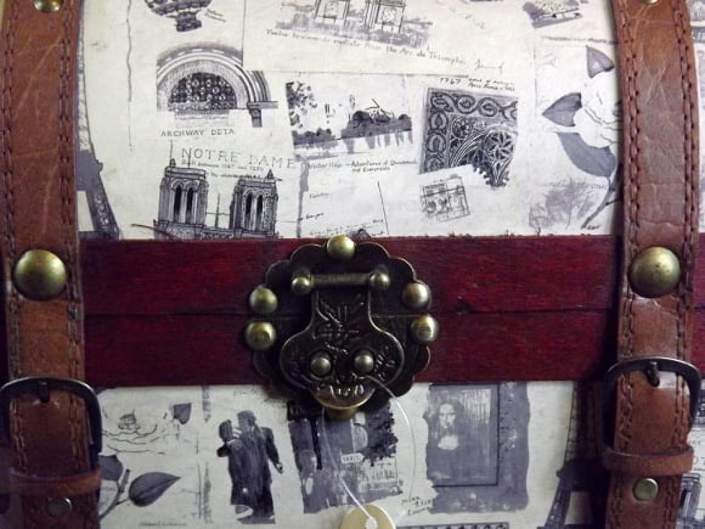 Wymiary kuferka wynoszą 45 x 29 x 28 cm, co sprawia, że idealnie nadaje się do przechowywania różnorodnych przedmiotów, od osobistych drobiazgów po akcesoria podróżnicze. Jasna, kremowa wstawka z nadrukiem o motywach podróżniczych dodaje mu charakteru i sprawia, że staje się nie tylko praktycznym organizerem, ale również stylowym elementem dekoracyjnym.