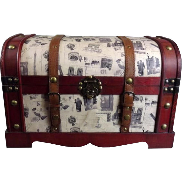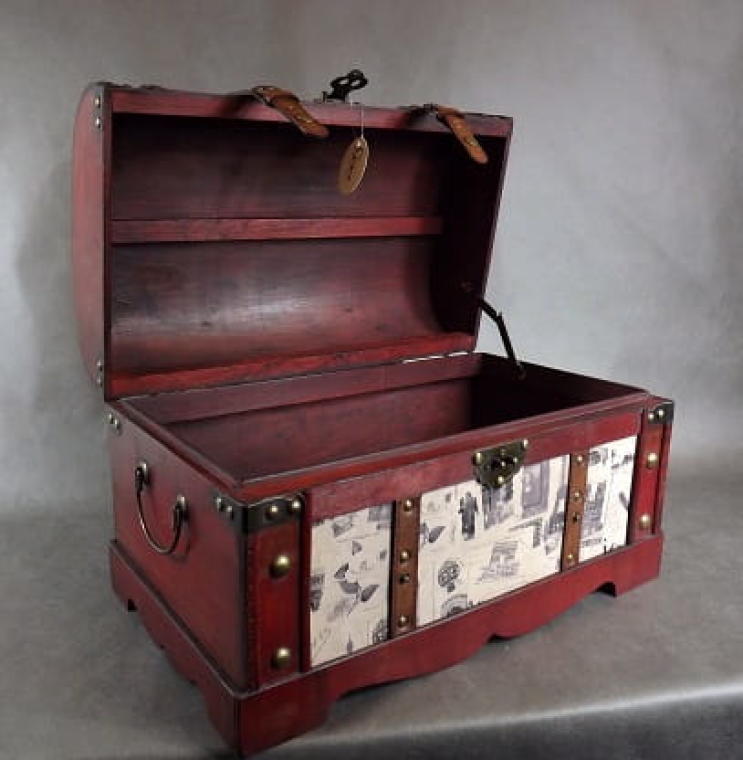 Mały kufer w kolorze wiśni to elegancki dodatek do każdej przestrzeni, łączący w sobie funkcjonalność i estetykę. Jako jeden z trzech modeli w zestawie, ten drewniany kufer zachwyca starannym wykonaniem oraz unikalnym designem.