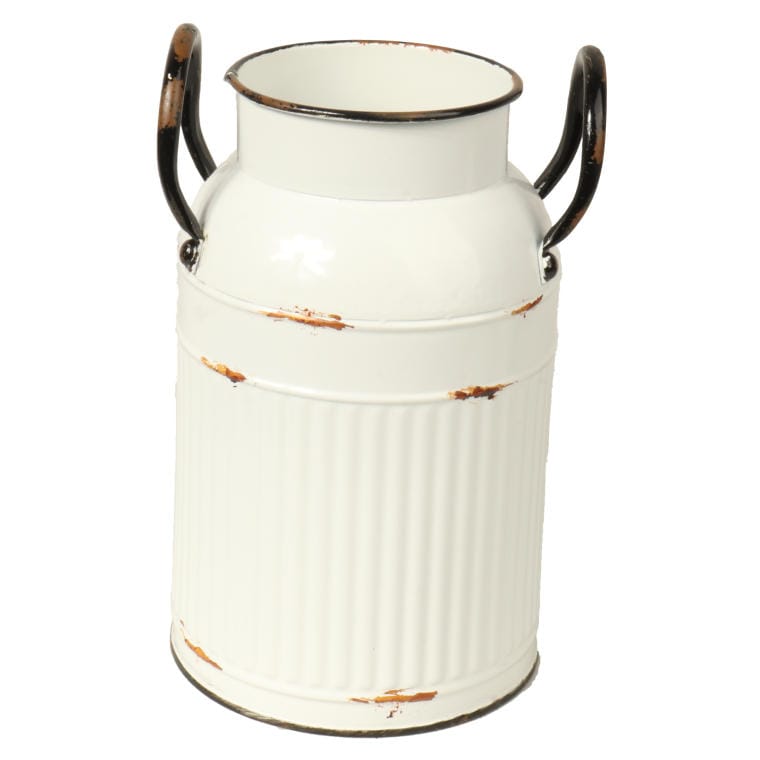 Metalowa kanka w kolorze białym z efektem postarzenia w postaci ciemnych przebarwień. Ta dekoracyjna kanka pięknie ozdobi kuchnię, jadalnię lub łazienkę w stylu Vintage lub Shabby Chick oraz może stanowić piękną ozdobę ogrodu. Wykonana jest z blachy ocynkowanej, malowanej proszkowo, posiada oryginalny kształt, dekoracyjne wytłoczenia oraz uchwyty, które w całości nadają stylowy, oryginalny wygląd. Bardzo staranne wykonanie. Jedna z dwóch w kolekcji- mniejsza. Wielkość: 21×13 cm