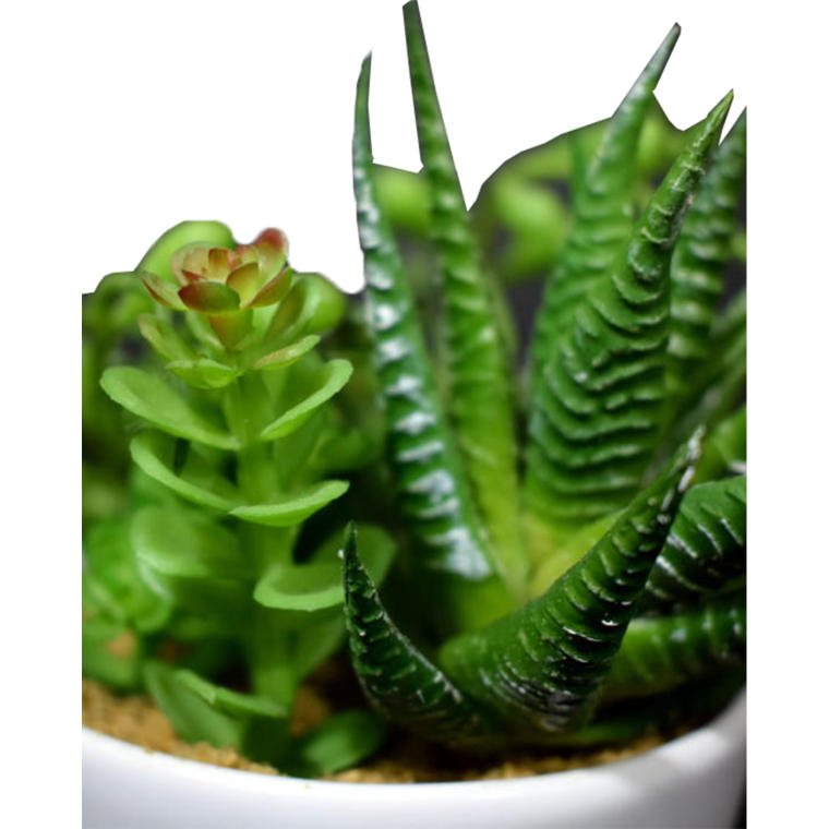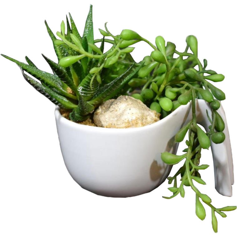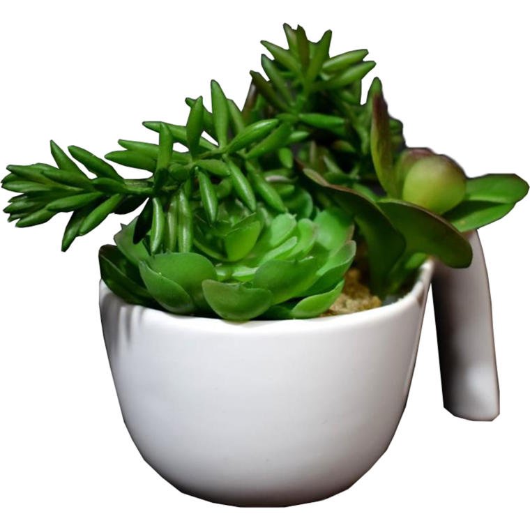 Mix sukulentów w białej ceramicznej doniczce z rączką