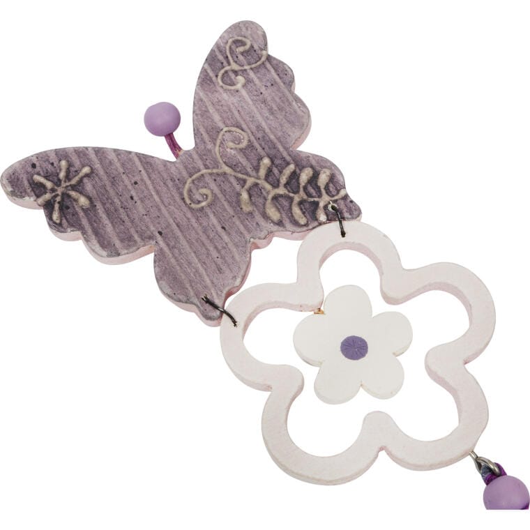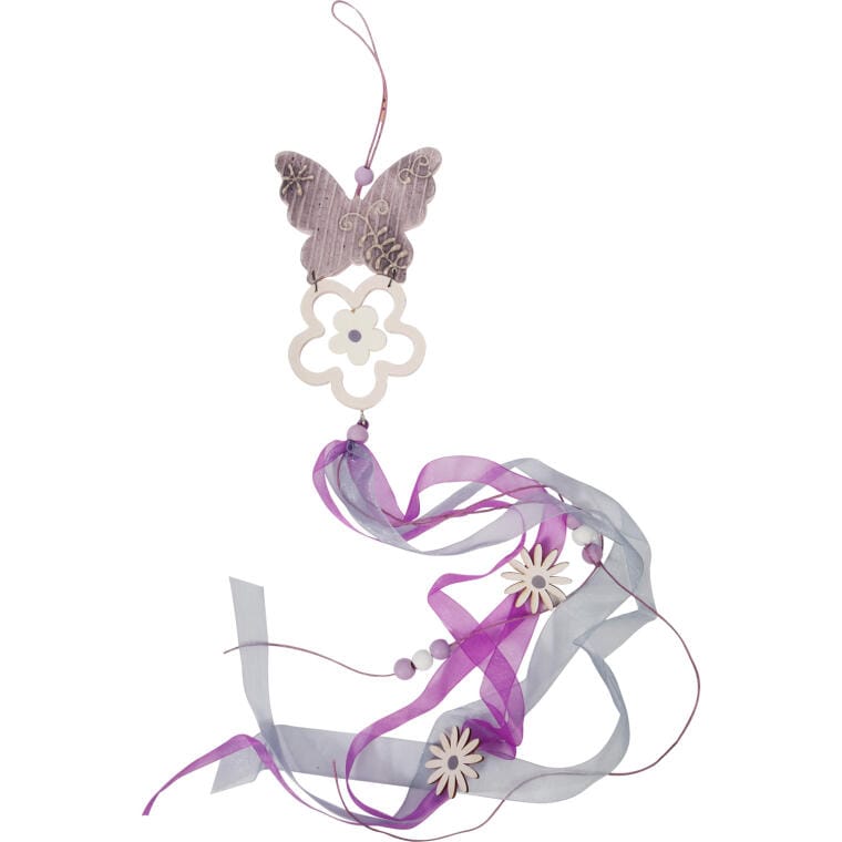 Przedstawiamy naszą wykwintną drewnianą ozdobę motyla ozdobioną uroczym kwiatem, czarujący element, który doda Twojemu domowi wyjątkowego akcentu wiosennej elegancji. Ten zachwycający wieszak ma pięknie wyblakły odcień fioletu, idealnie uzupełniony przez płynące wstążki, które wdzięcznie kaskadowo opadają, tworząc kapryśną i świąteczną atmosferę.