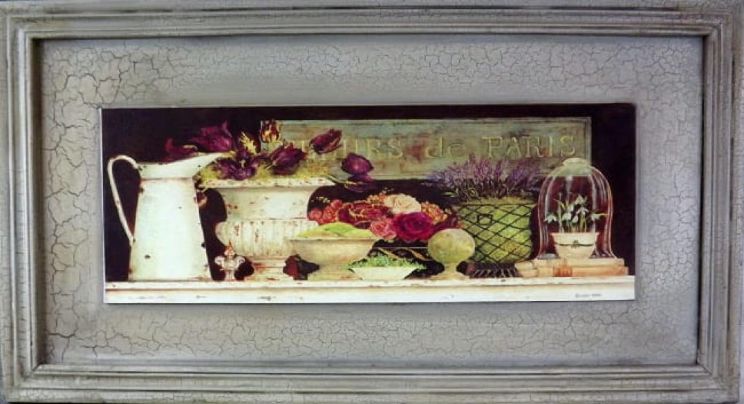 Obraz postarzany kwiaty z dzbankami 30 x 56 cm