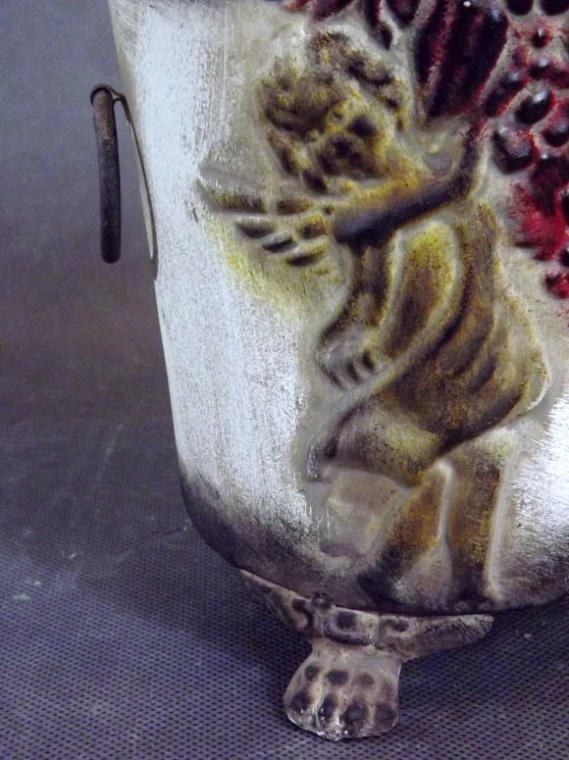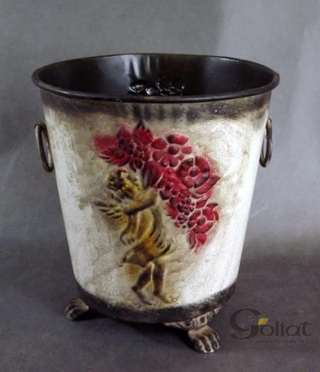 Elegancka osłonka z metaloplastyki w kolorze kremowym to stylowy dodatek do Twojego wnętrza. Ozdobiona motywem anioła, zachwyca subtelnym designem i klasycznym urokiem. Wyposażona w nóżki oraz uchwyty w postaci metalowych kółek, łączy w sobie funkcjonalność i estetykę. Jest to średni model z kolekcji, idealny do eksponowania roślin lub jako pojemnik dekoracyjny. Doskonale sprawdzi się w aranżacjach klasycznych, rustykalnych i romantycznych. Wymiary: 19,5×18 cm, średnica 17 cm.