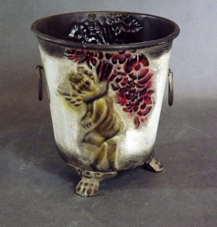 Mały pojemnik-osłonka z metaloplastyki w kremowym kolorze, ozdobiony delikatnym motywem anioła, to idealny akcent dekoracyjny do Twojego domu. Dzięki eleganckim nóżkom i uchwytom w formie metalowych kółek, doskonale nadaje się zarówno do wyeksponowania roślin, jak i jako samodzielna ozdoba. Jest to najmniejszy z trzech modeli w kolekcji, wyróżniający się finezyjnym wykończeniem i uniwersalnym stylem. Idealnie pasuje do wnętrz w stylu klasycznym, shabby chic lub prowansalskim. Wymiary: 16×15 cm, średnica 13,5 cm.