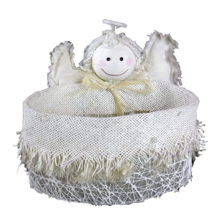 Koszyk z wielkością z aniołem w kolorze białym to piękna dekoracja, która doda elegancji i magicznego wnętrza. O wymiarach 20 x 21 cm, dziesięć uroczych koszyków sprawdziło się jako dekoracja stołu, komody czy parapetu, wprowadzając świąteczną atmosferę do każdego pomieszczenia.