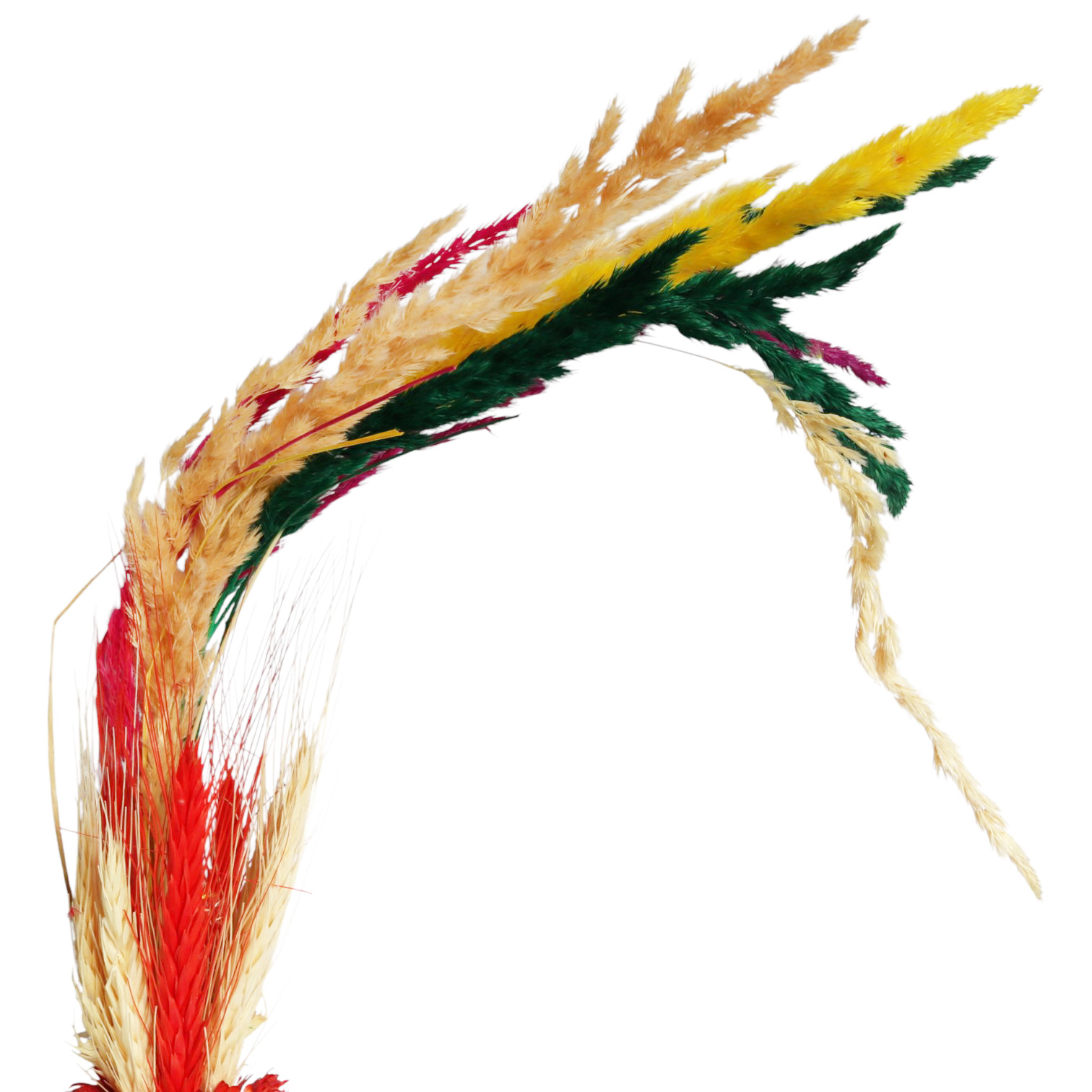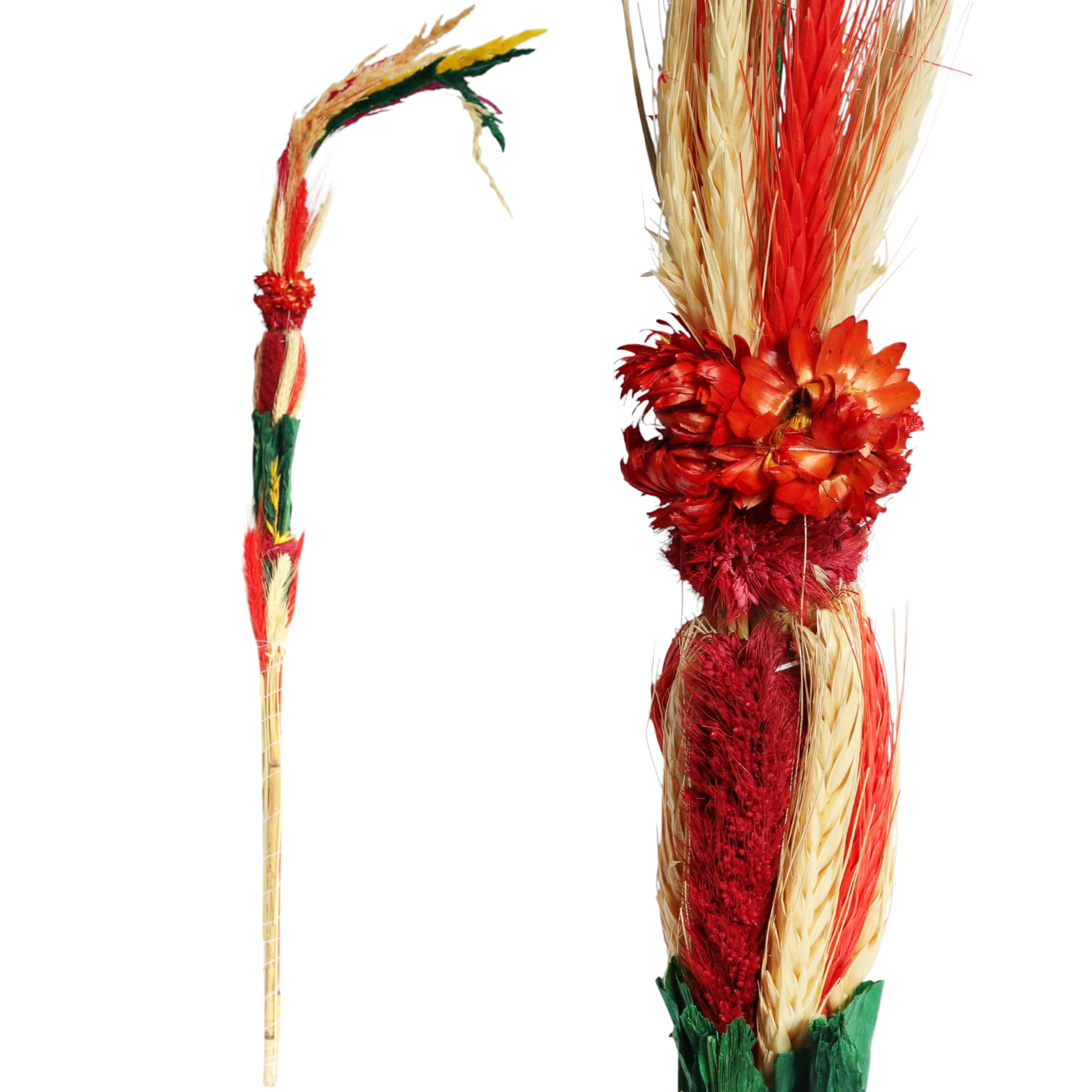 Palma zdobiona jest suszoną roślinnością z polskich łąk w tym kwiatami typu „nieśmiertelniki” oraz suszonymi kłosami zbóż, barwionymi na różne, żywe kolory. Naturalne materiały i ręczne wykonanie sprawiają, że każda palma ma unikalny charakter i niepowtarzalną kompozycję.