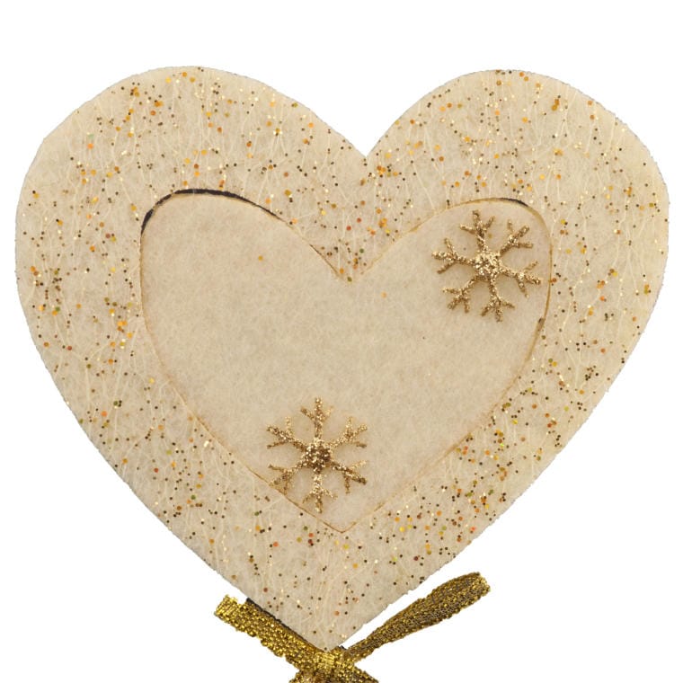 Pik w kształcie serca, wykonany z filcu w kremowym kolorze i ozdobiony subtelnymi złoceniami, to elegancki i uniwersalny dodatek do różnych dekoracji. Jego delikatny wygląd oraz ciepła kolorystyka sprawiają, że doskonale sprawdzi się w kompozycjach świątecznych, bukietach czy jako ozdoba prezentów, wprowadzając subtelny, dekoracyjny akcent.