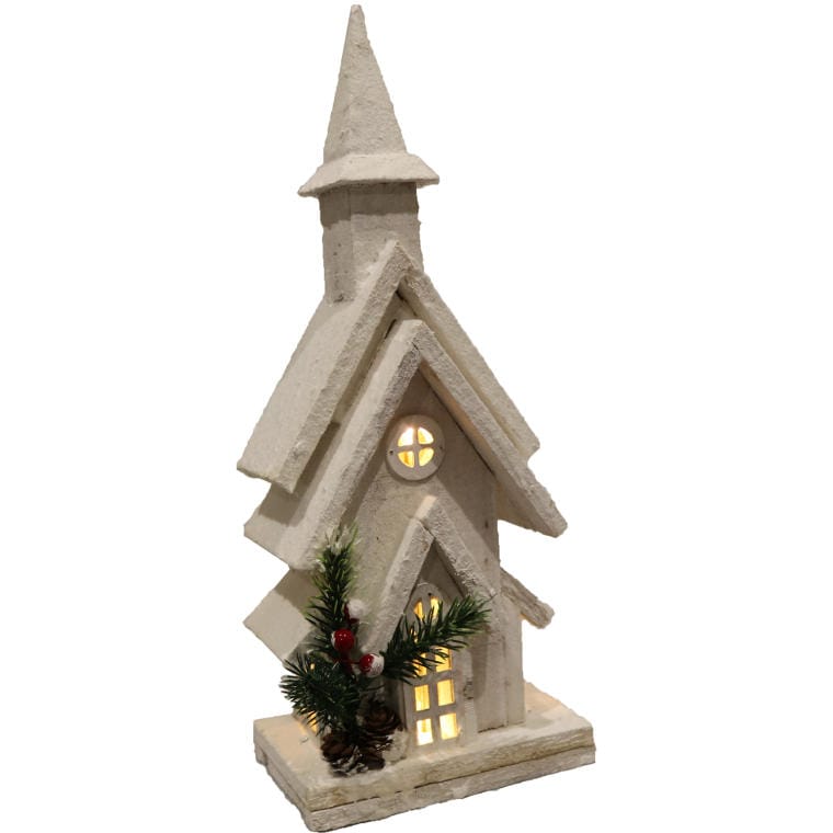 Podświetlana Dekoracja Świąteczna – Ośnieżony Kościółek z LED, Wymiary 38 cm, Kolor Biały, Zasilanie Bateryjne