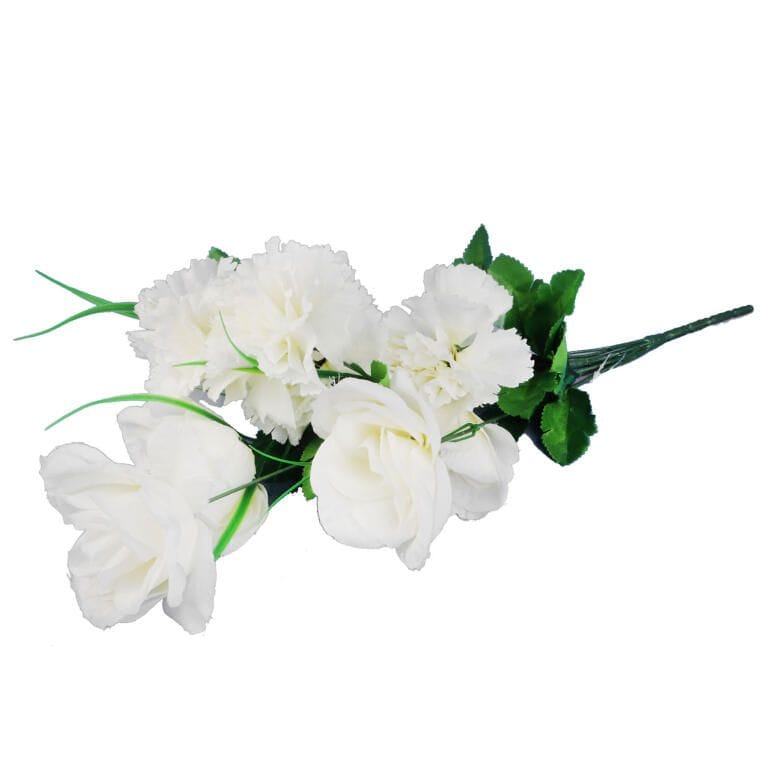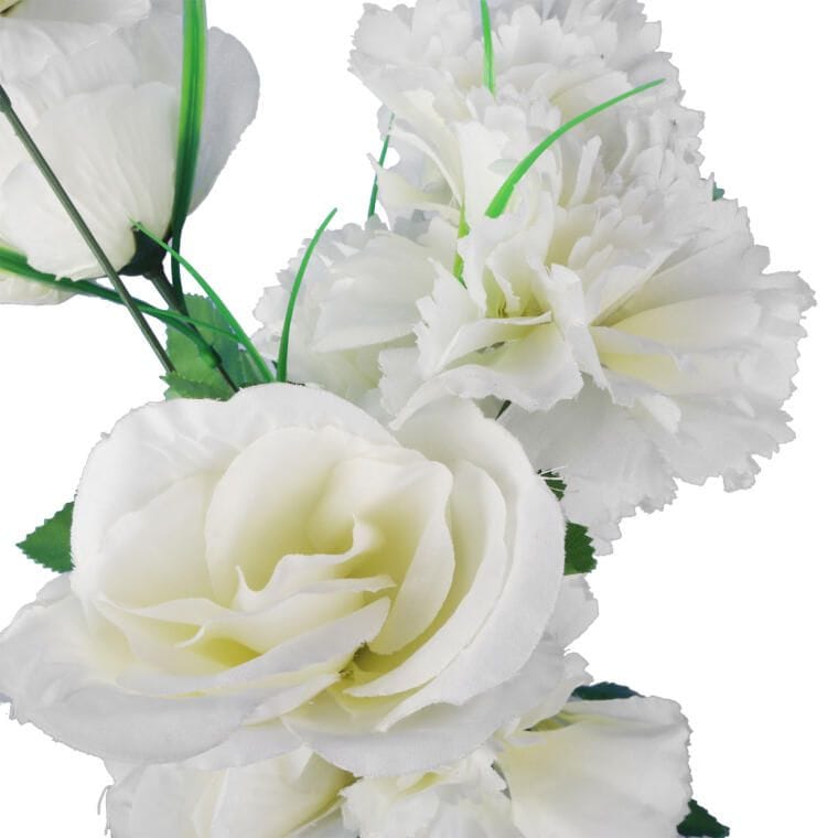 Sztuczny bukiet z róż i goździków to elegancka kompozycja, która zachwyca realistycznym wyglądem. Perfekcyjnie imituje naturalne kwiaty, dodając wnętrzom, tarasom czy miejscom pamięci wyjątkowego uroku i klasy. Doskonale sprawdzi się zarówno jako samodzielna dekoracja, jak i w większych aranżacjach, podkreślając ich estetykę i harmonię. Bukiet o wysokości 52 cm i średnicy 10 cm.
