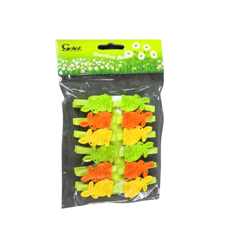 Pomarańczowe Drewniane Klamerki z Filcowymi Figurkami Zajączków – Komplet 12 Sztuk