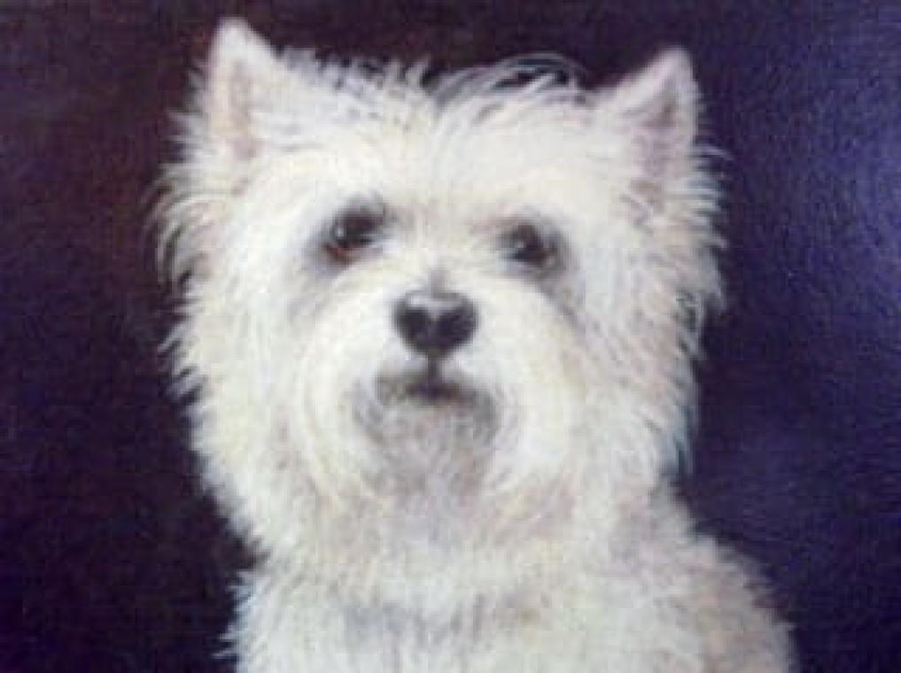 Postarzany Obraz z Białym Terierem na Stołku 41×41 cm – Część Tryptyku
