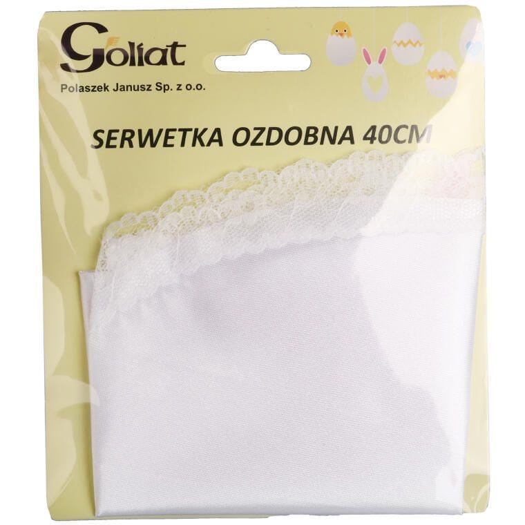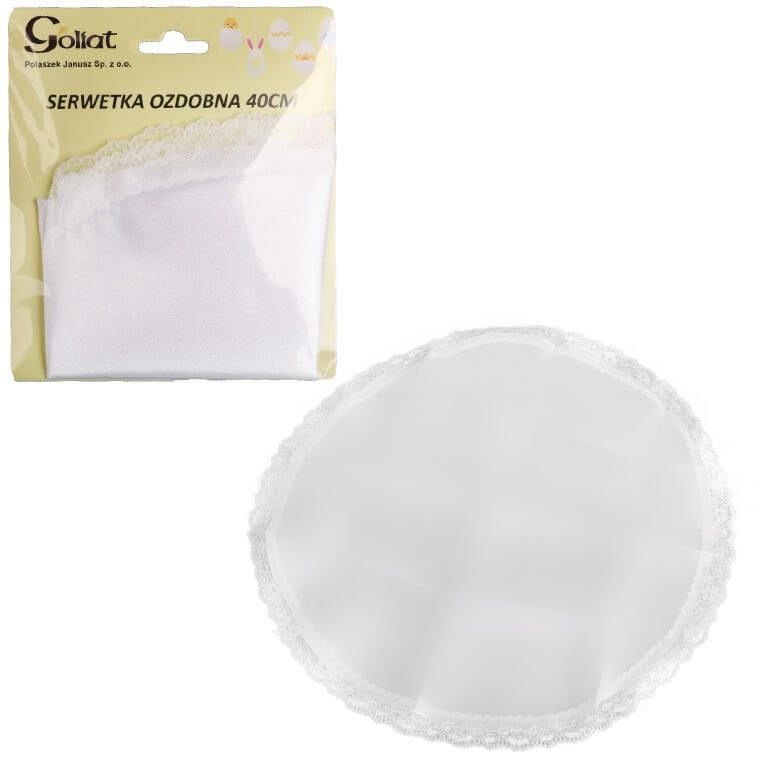 Serwetka wielkanocna wykonana z wysokiej jakości białej tkaniny poliestrowej, starannie wykończona z dbałością o każdy detal, to elegancki element dekoracyjny, który doskonale wzbogaci Twoje świąteczne aranżacje. Jej delikatne brzegi zdobi subtelna koronka, która nadaje serwetce wyjątkowy, klasyczny charakter. Okrągła serwetka o średnicy 40 cm jest idealna do ozdoby koszyczka wielkanocnego, a także świetnie sprawdzi się w innych dekoracjach świątecznych. Wykonana w 100% z poliestru, łączy estetykę z praktycznością, gwarantując trwałość i łatwość w utrzymaniu.
