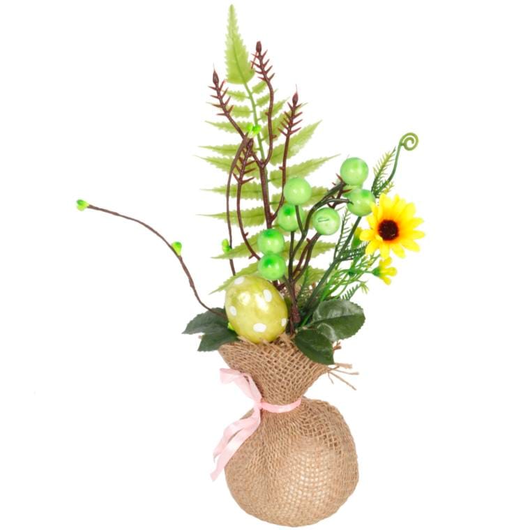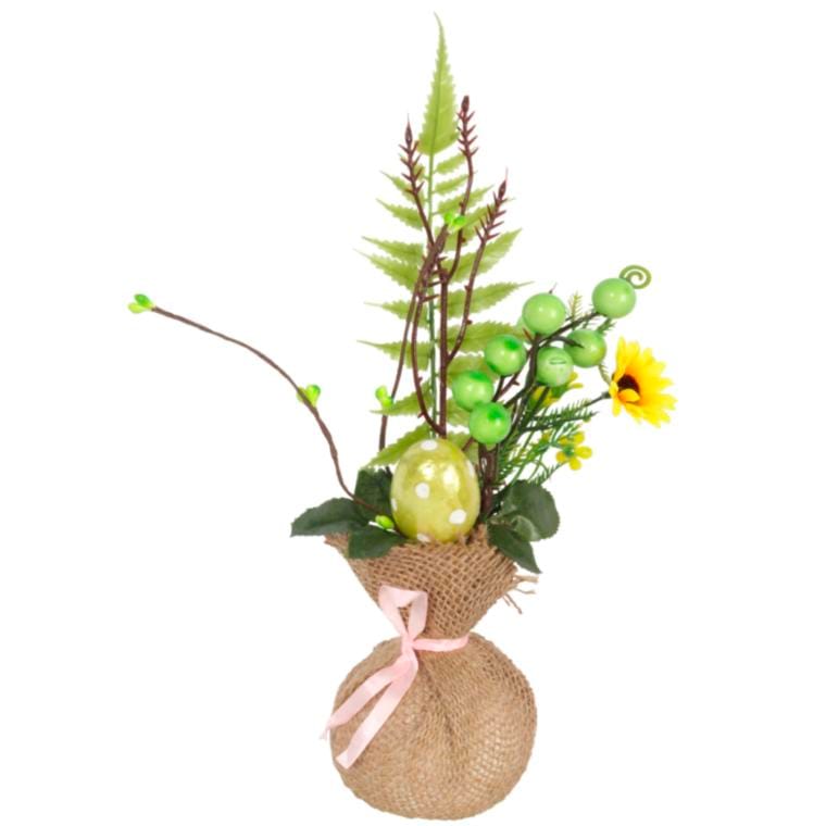 Ta wyjątkowa dekoracja wielkanocna w ciepłych, wiosennych barwach to doskonały dodatek, który ożywi każde wnętrze, wprowadzając świąteczny nastrój. Ozdoba wykonana jest z wysokiej jakości materiałów, a jej naturalne elementy, takie jak juta, nadają kompozycji stylowego, rustykalnego charakteru. Wysokość dekoracji wynosi około 27 cm, co czyni ją idealnym elementem wystroju stołu, biura lub restauracji. Kolorystyka zgodna ze zdjęciem, a w skład kompozycji wchodzą dekoracyjne kuleczki, jajeczko i zielone akcenty, które podkreślają wiosenny klimat. To elegancki, oryginalny dodatek, który nie tylko ozdobi wnętrze, ale także świetnie sprawdzi się jako niezobowiązujący prezent świąteczny.