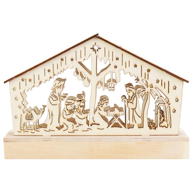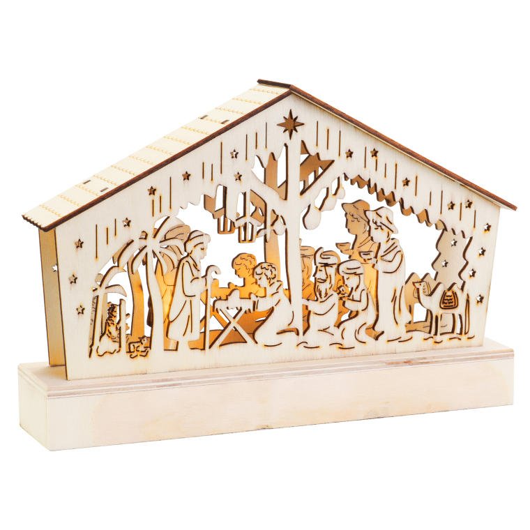 Szopka Bożonarodzeniowa z Drewna z Ciepłym Podświetleniem LED, Kolor Kremowy, Zasilanie Bateryjne.