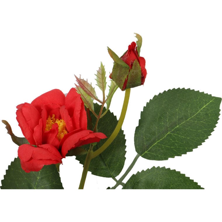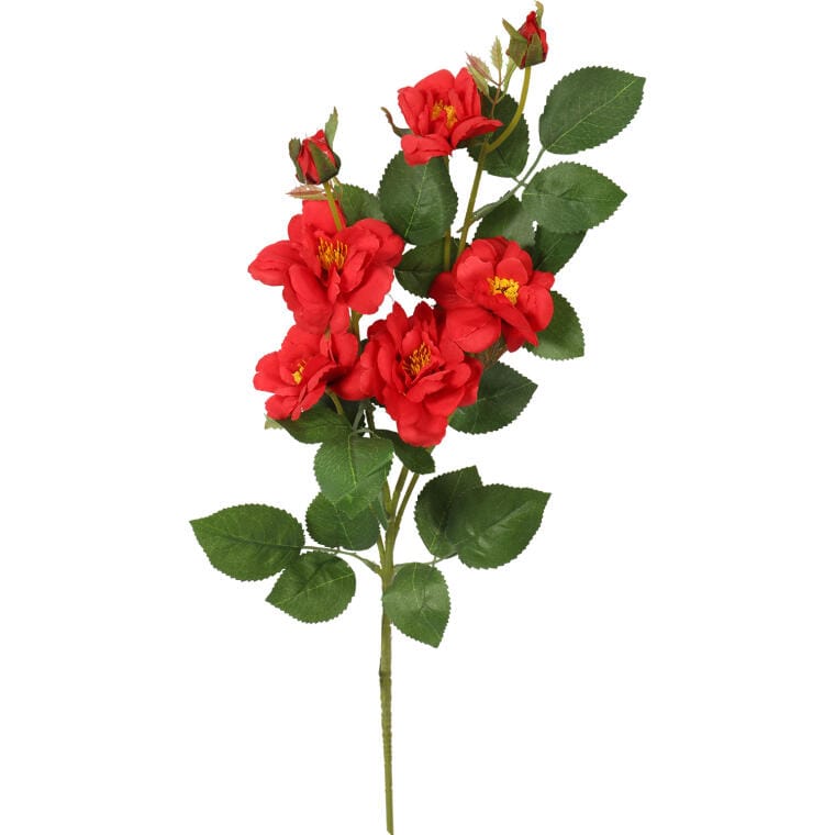 Sztuczna gałązka róż z pięcioma pełnymi kwiatami i dwoma pąkami w intensywnym czerwonym kolorze to efektowna dekoracja, która dzięki zastosowaniu materiałów najwyższej jakości do złudzenia przypomina żywe kwiaty. Starannie odwzorowane detale, takie jak struktura płatków i realistyczny wygląd pąków, sprawiają, że róże prezentują się niezwykle autentycznie, wprowadzając do wnętrza odrobinę elegancji i romantyzmu. Idealnie sprawdzą się zarówno jako samodzielna ozdoba, jak i w większych kompozycjach florystycznych, nadając przestrzeni wyjątkowego charakteru. Z wysokością 72 cm, ta sztuczna róża doskonale nadaje się do wazonów, bukietów oraz innych aranżacji, podkreślając styl i przytulność każdego pomieszczenia.