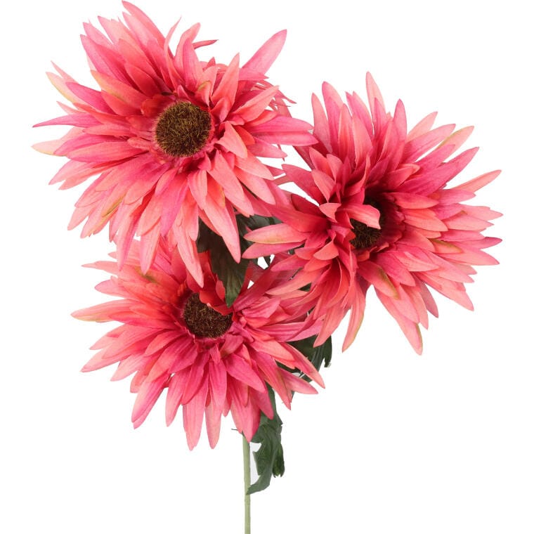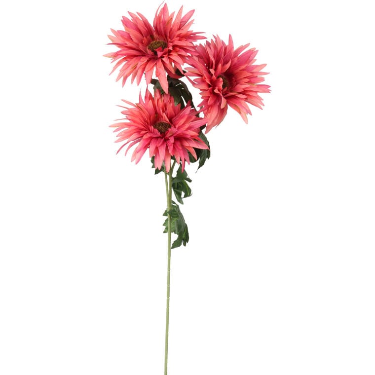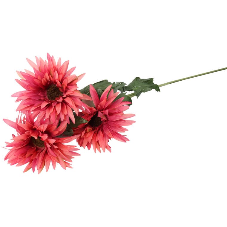 Sztuczna gałązka z trzema gerberami w kolorze różowym, wykonana z wysokiej jakości materiałów, które sprawiają, że kwiaty wyglądają jak żywe. Idealna jako samodzielna dekoracja lub część większej kompozycji, doskonale ożywi każde wnętrze, dodając mu uroku i świeżości. Wysokość: 80 cm.