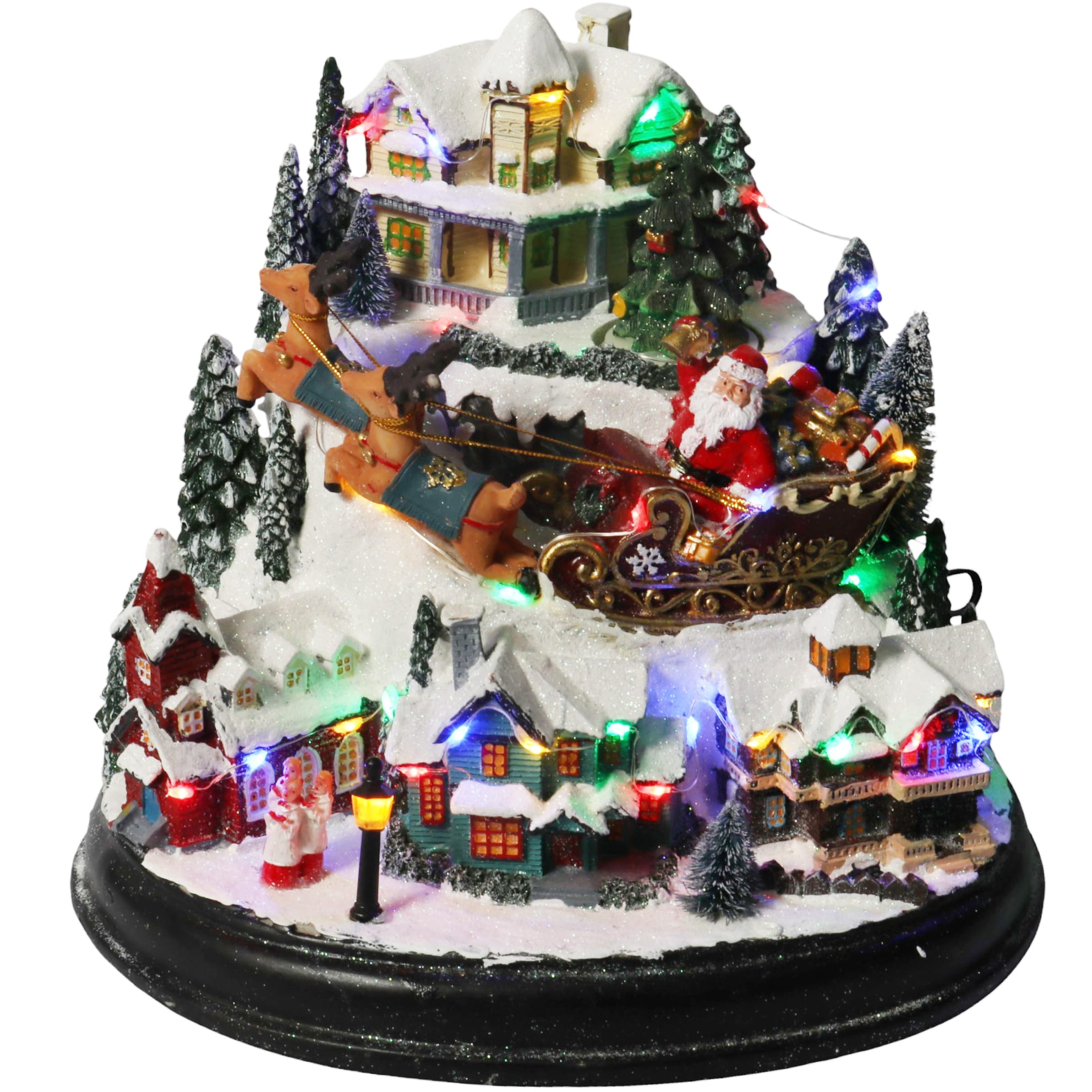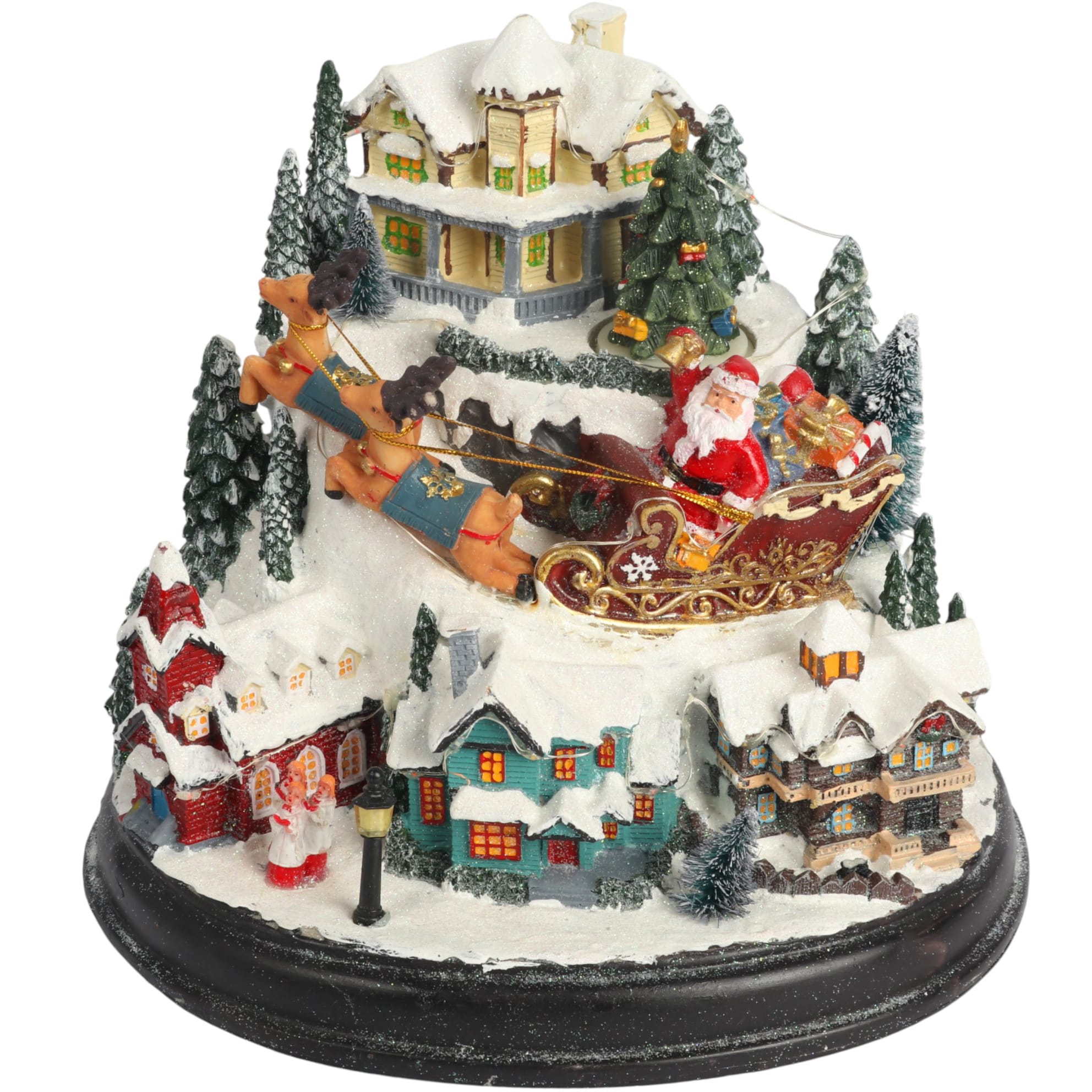 Spektakularna dekoracja świąteczna ukazująca zimowy krajobraz z kolorowym miasteczkiem, pełnym świateł, ruchu i świątecznej magii. W centralnej części jadą sanie z Mikołajem, przywodzące na myśl świąteczną podróż przez zaśnieżone krajobrazy. Całość rozświetlają kolorowe diody LED, a towarzysząca muzyka – znane kolędy – wprowadza w bajkowy nastrój. Dekoracja może być zasilana zarówno z gniazdka, jak i na baterie.