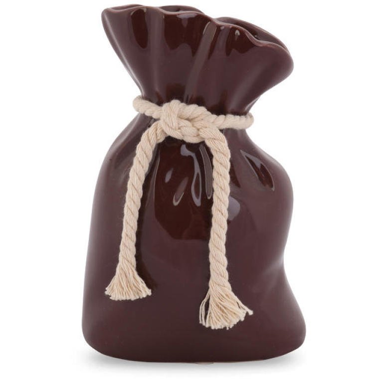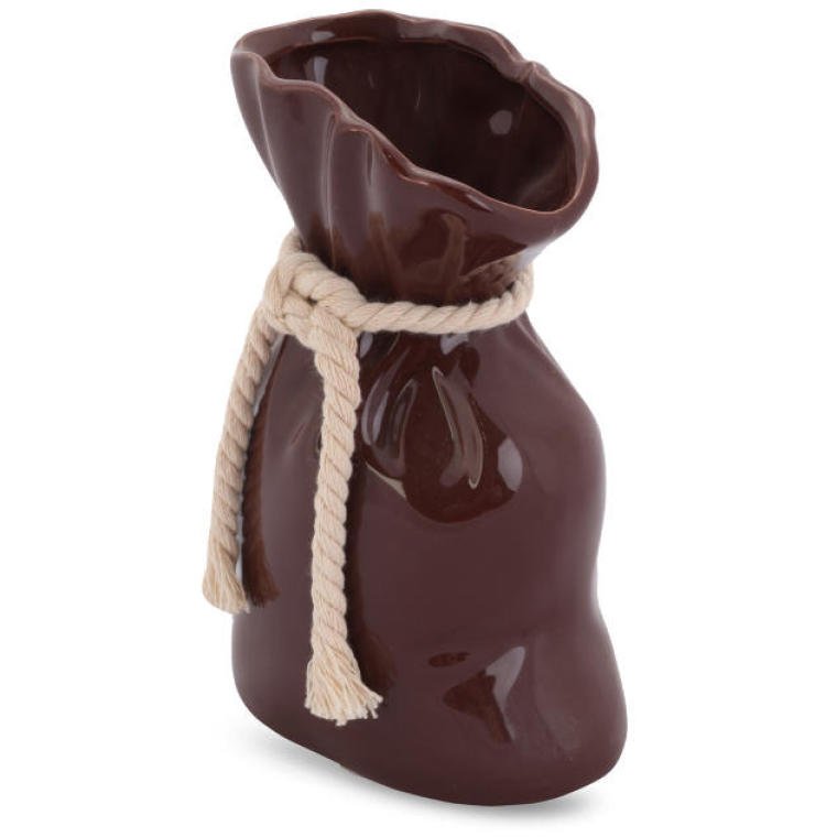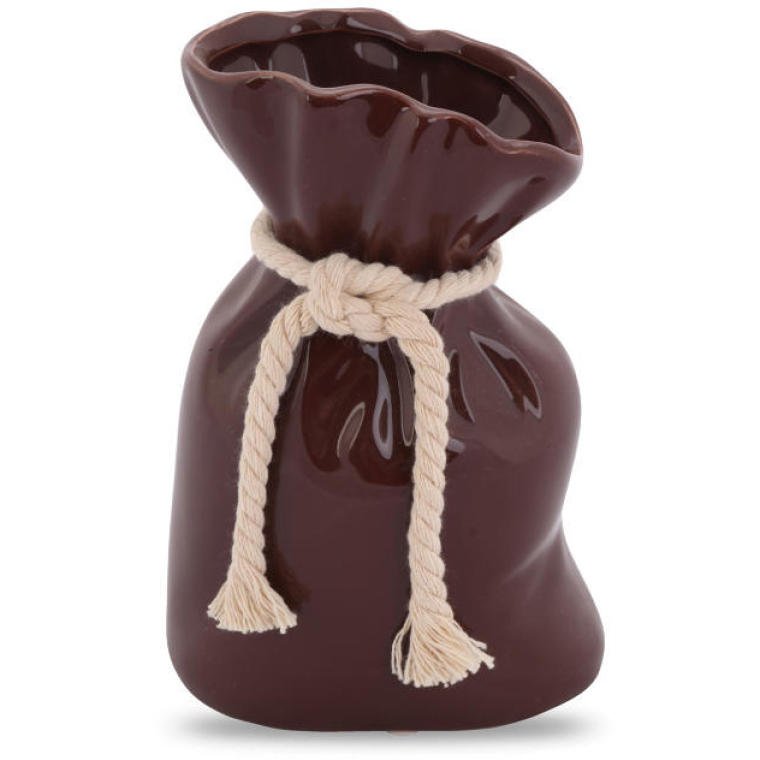 Brązowy wazon dekoracyjny swoim wyglądem przypomina sakiewkę. Dzięki bardzo modnym kształtom nikt nie przejdzie obok niego obojętnie. Ten ceramiczny wazon skomponuje się z kwiatami sztucznymi, jak i żywymi. Wyposażony został w sznur, który dodaje mu uroku i stylu oraz antypoślizgowe podkładki. Jest to produkt wykonany z najwyższej jakości materiałów, co gwarantuje trwałość i żywy kolor wazonu przez wiele lat użytkowania.