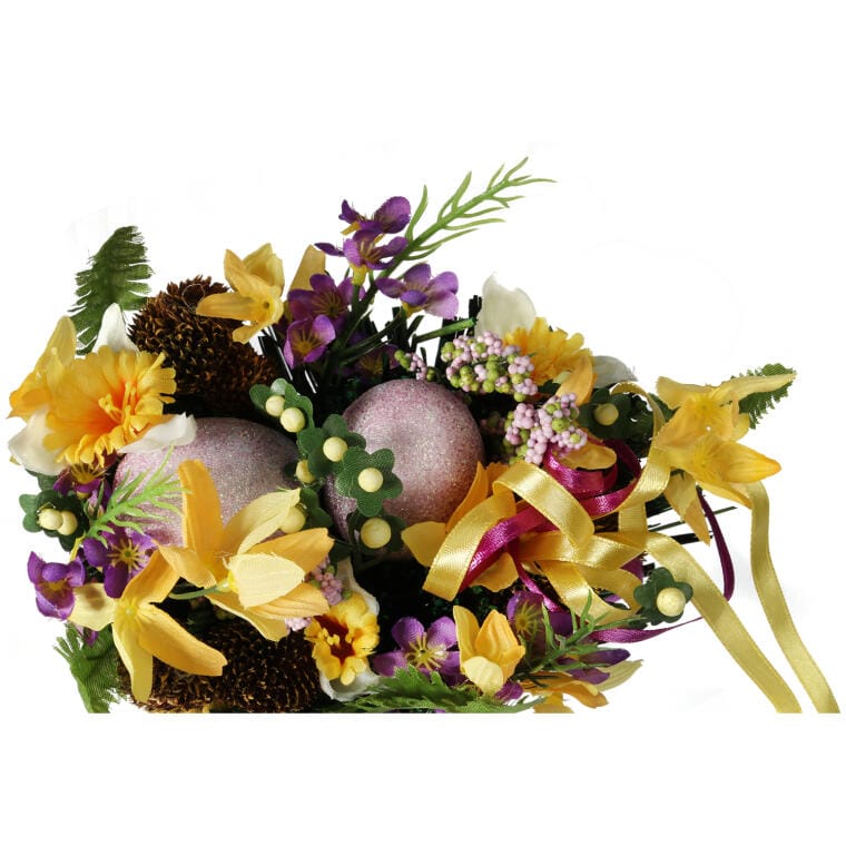 Wielkanocny bukiet dekoracyjny z suszu i jajkami w tonacji fioletowo-żółto-zielonej