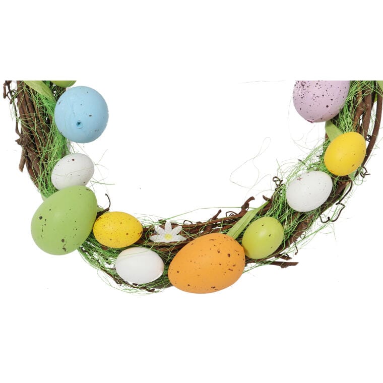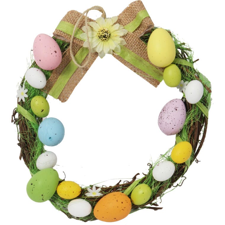 Wielkanocny wianek dekoracyjny z kolorowymi jajkami i haczykiem do zawieszenia