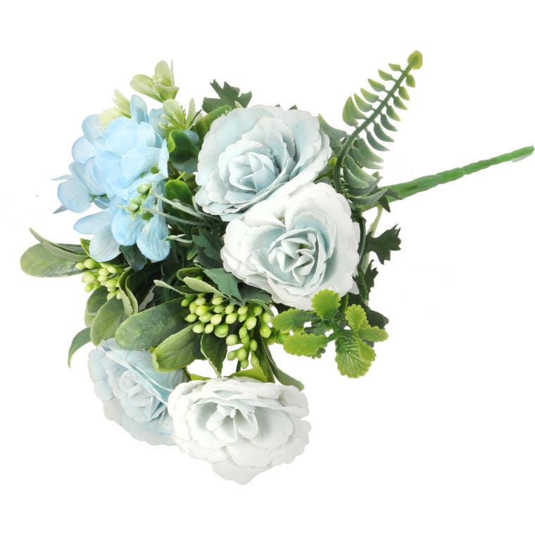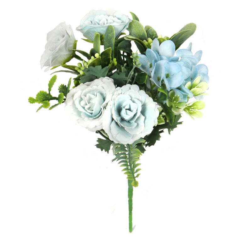 Ten bukiecik sztucznych kwiatów w delikatnym odcieniu pudrowego błękitu to elegancka kompozycja składająca się z 5 gałązek, na których znajdują się subtelne różyczki, zachwycające hortensje oraz starannie dobrane dodatki. O wyjątkowej jakości wykonania, ten bukiecik jest nie tylko trwały, ale także niezwykle realistyczny, wnosząc świeżość i lekkość do każdej wiosennej aranżacji. Jego wysmakowany, pudrowy kolor idealnie pasuje do stylowych wnętrz, a wysokość 30 cm sprawia, że będzie doskonałą ozdobą zarówno w wazonie na stole, jak i jako uzupełnienie innych dekoracji.
