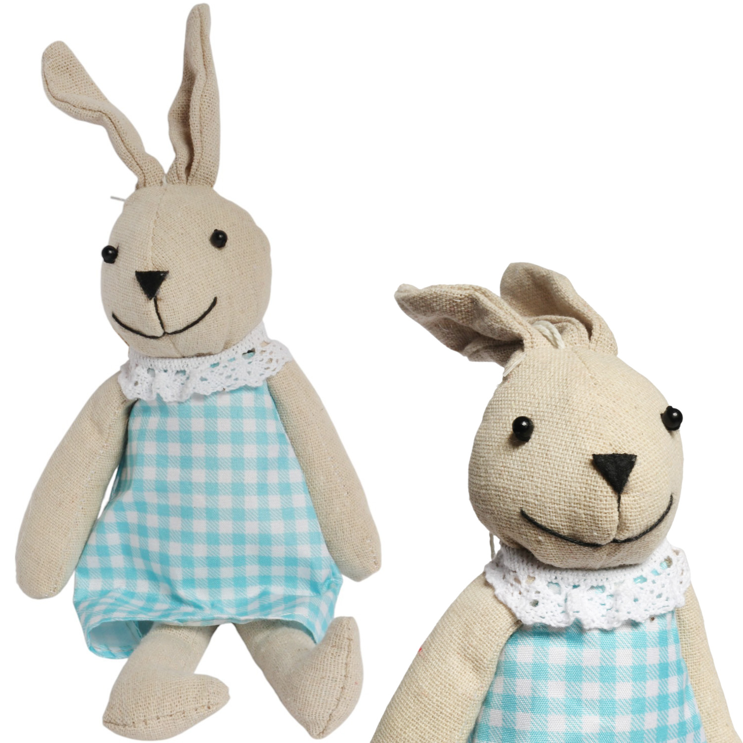 Zając zawieszka lniana Ozdoba Wielkanocna Figurka w niebieskiej sukience 26 cm