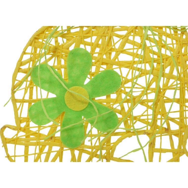 ZAWIESZKA Z RAFII- ZAJĄC W KOLORZE ŻÓŁTYM Z FILCOWĄ, ZIELONĄ DEKORACJĄ Wielkość: 30 x 20 cm Gdzie wykorzystasz zajączka wielkanocnego? Jajko wielkanocne to przykład efektownej wiosennej dekoracji, która przywodzi na myśl wszystko to, co kojarzy się z Wielkanocą: budzącą się do życia przyrodę, świeżość i czas spędzany z bliskimi przy rodzinnym stole. Skoro o stole mowa, zajączka wielkanocnego możesz postawić na nim jako dekorację. Możesz też włożyć je do koszyczka wielkanocnego, obok pokarmów, które zgodnie z tradycją święcone są w Wielką Sobotę, a następnie spożywane podczas śniadania wielkanocnego. Jajko wielkanocne niezwykle atrakcyjnie będzie także wyglądało ułożone na talerzu lub tacy z wysianą rzeżuchą. Dlaczego zając jest symbolem Wielkanocy? Zajączek wielkanocny, tak wyczekiwany przez najmłodszych podczas wielkanocnego śniadania, stał się jednym z najważniejszych symboli świąt Wielkanocy. Skąd wzięła się ta tradycja i jaka symbolika wiąże się z tym sympatycznym długouchym zwierzakiem? Jak w przypadku wielu wielkanocnych atrybutów tradycja zająca wielkanocnego wywodzi się jeszcze z czasów pogańskich. Zając symbolizował płodność, witalność i dobrobyt oraz odradzającą się po zimie przyrodę. Legenda głosi, że był ulubionym zwierzęciem przedchrześcijańskiej bogini Eoster czczonej wraz z nadejściem wiosny. To od jej imienia wzięła się angielska nazwa świąt wielkanocnych (Easter).