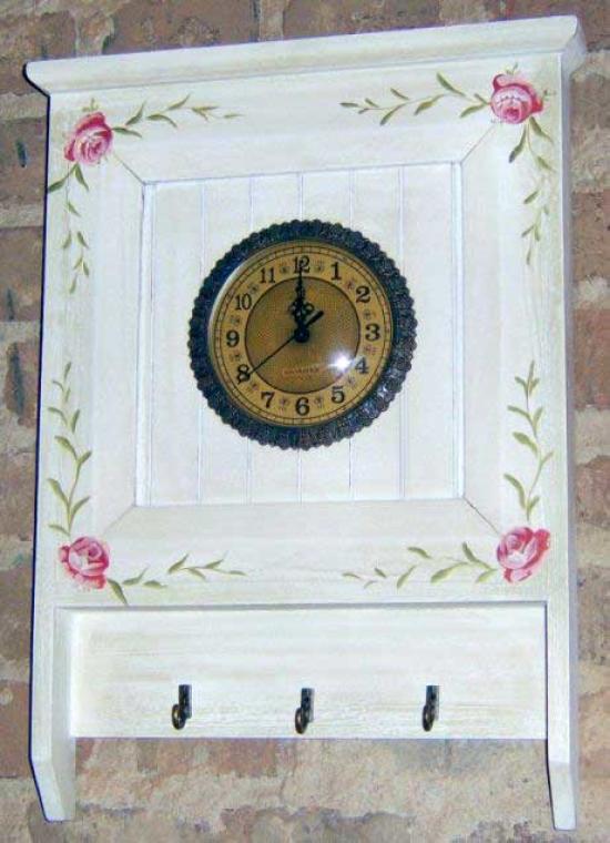 Zegar Wiszący w Stylu Prowansalskim z Wieszakami i Ręcznie Malowanymi Kwiatami, Biały, 49x36x5 cm