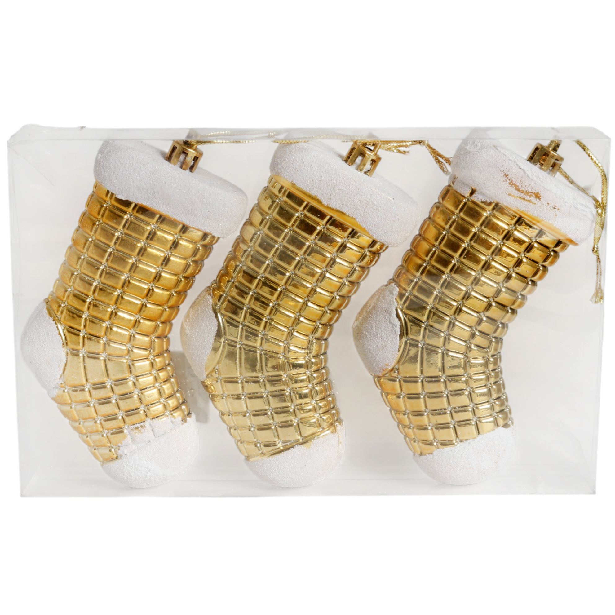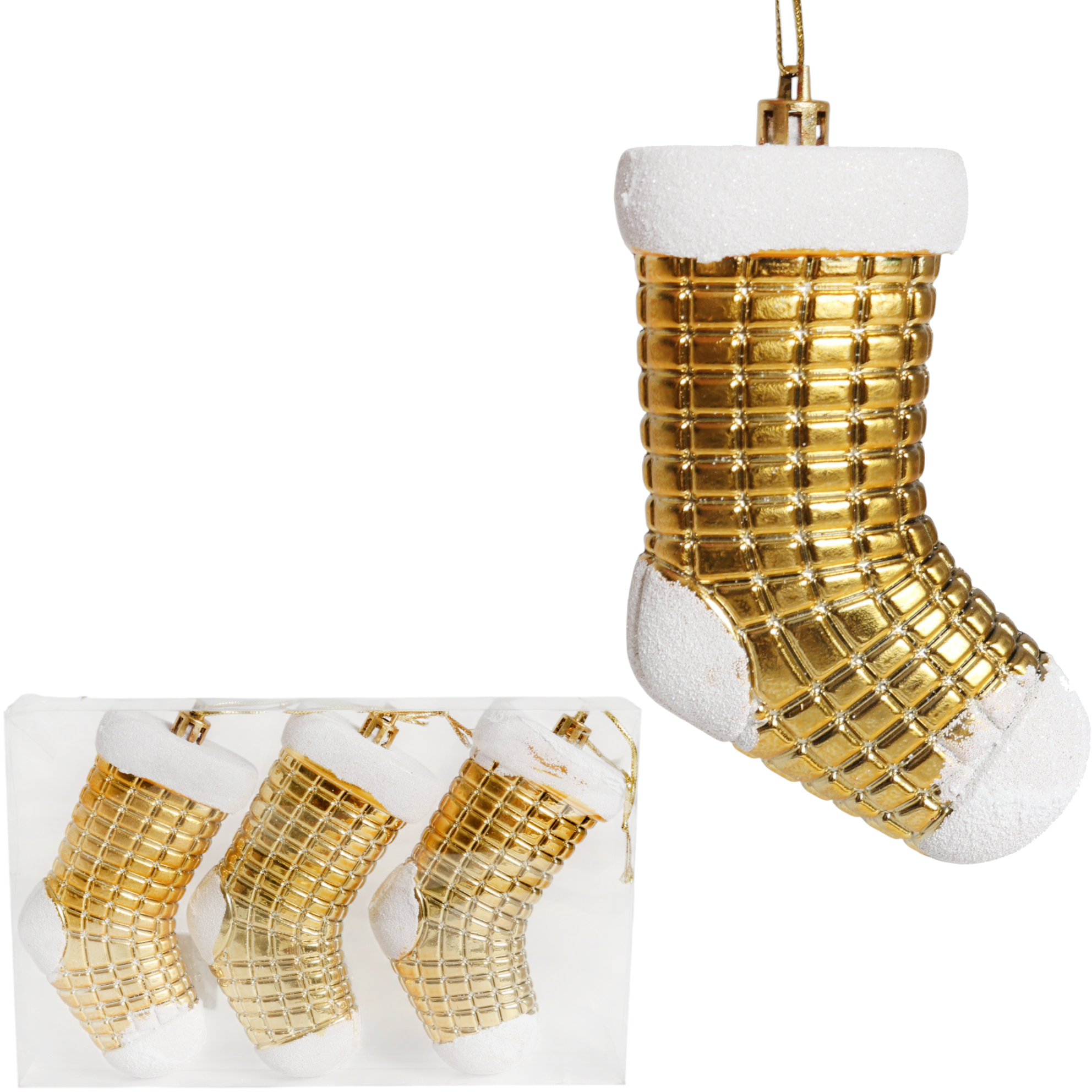 Zestaw 3 Bombek Bożonarodzeniowych w Kształcie Skarpet 10 cm – Wytrzymałe i Dekoracyjne Ozdoby Świąteczne Złote
