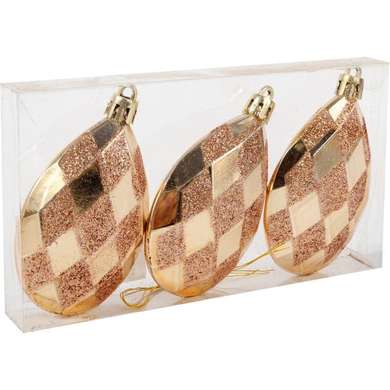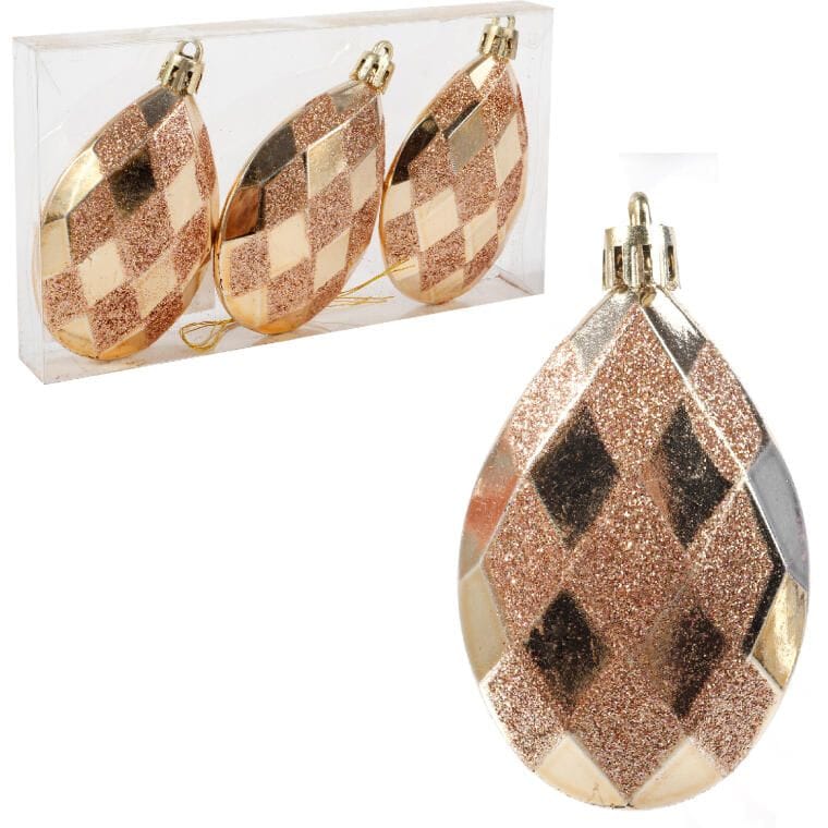 Zestaw 3 Złotych Bombek w Kształcie Kropli, 9 cm, z Brokatowym Dekorem