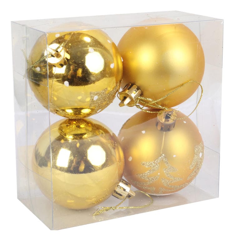 Zestaw 4 bombek plastikowych o matowym i połyskującym wykończeniu, ozdobionych brokatowym dekorem, to elegancka propozycja na świąteczną choinkę. Każda bombka ma średnicę 6 cm, co sprawia, że idealnie nadają się do zawieszenia zarówno na dużych, jak i małych drzewkach.