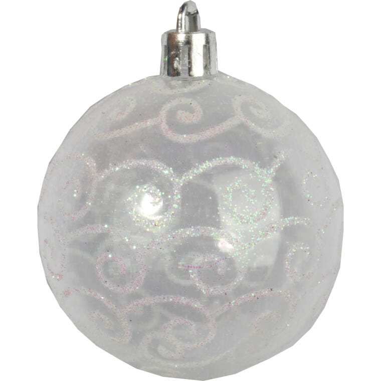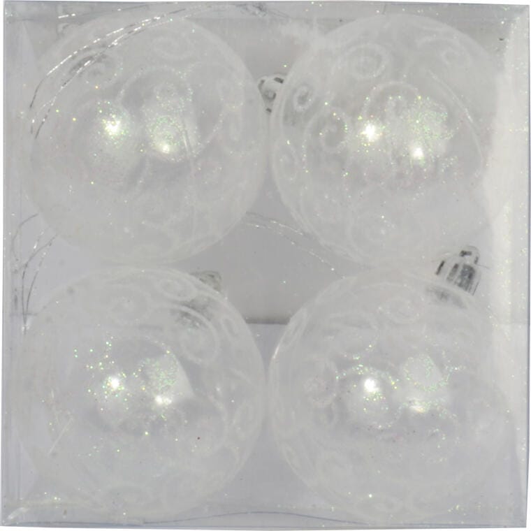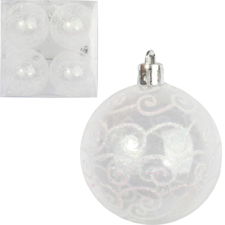 Zestaw 4 Przezroczystych Bombek Plastikowych z Białym Dekorem Śniegu, 8 cm