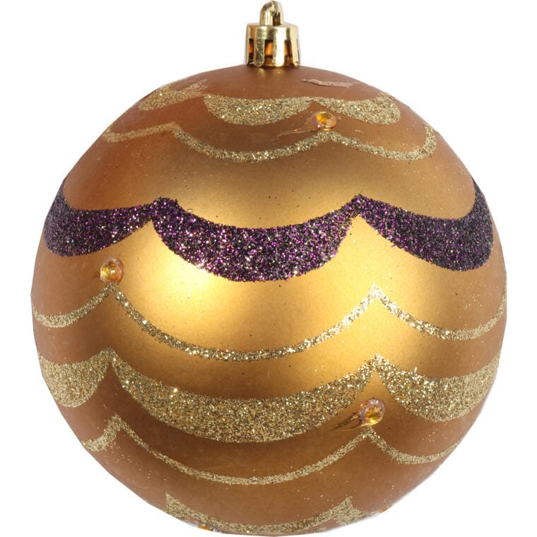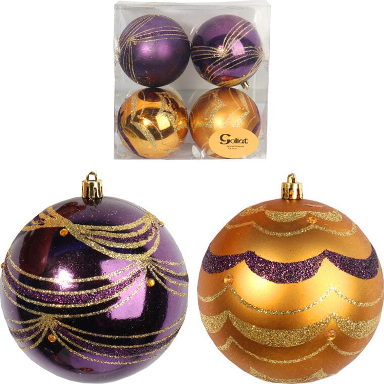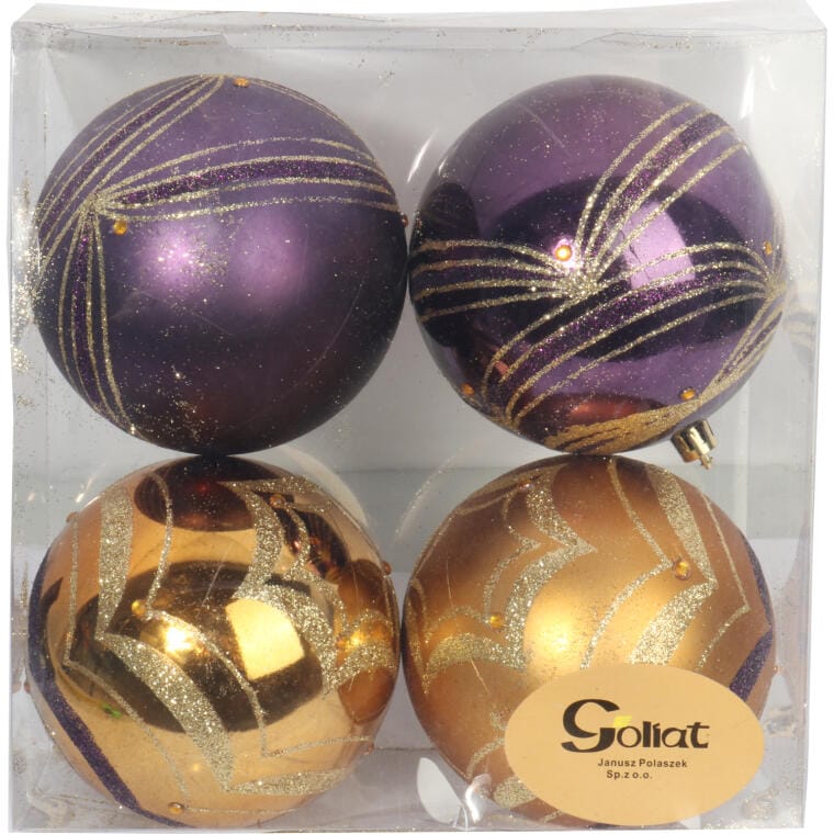 Zestaw 4 Plastikowych Bombek z Brokatowym Dekorem 10 cm – Złote i Fioletowe