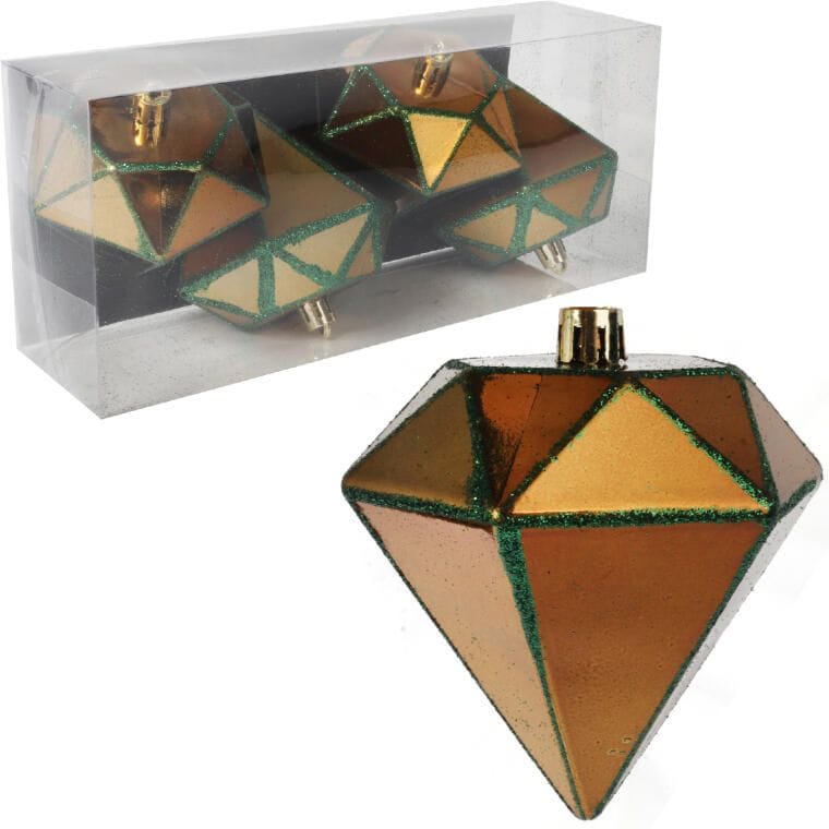 Zestaw 4 Złotych Bombek Plastikowych w Kształcie Diamentów z Zielonym Brokatem, 10 cm