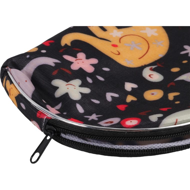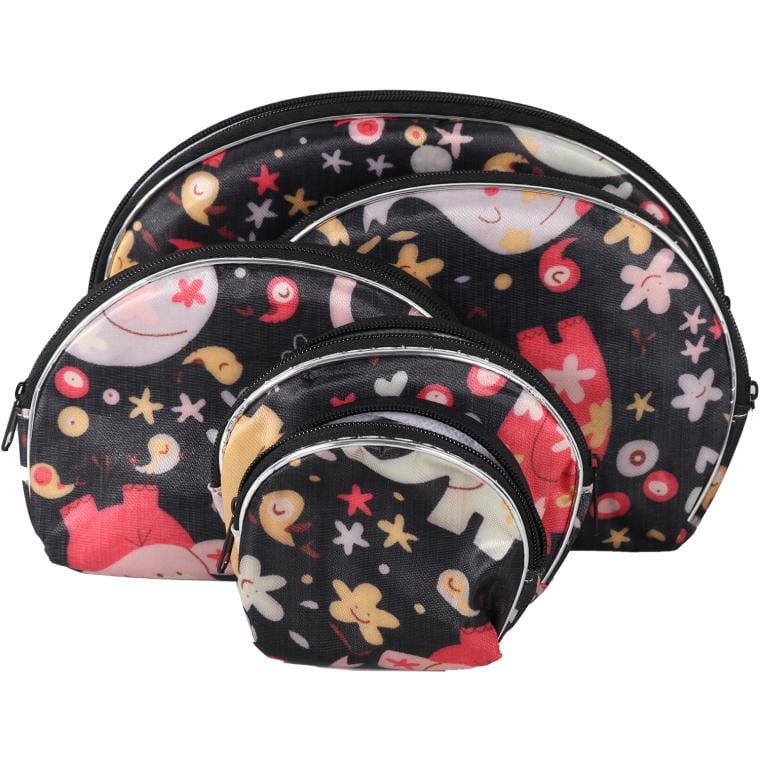 Oferujemy zestaw pięciu kosmetyczek zapinanych na zamek w eleganckim czarnym kolorze, ozdobionych kolorowymi słoniami, które dodają im unikalnego i radosnego charakteru. Każda kosmetyczka w tym zestawie ma różne wymiary, co pozwala na swobodne przechowywanie różnych kosmetyków, akcesoriów lub drobiazgów.