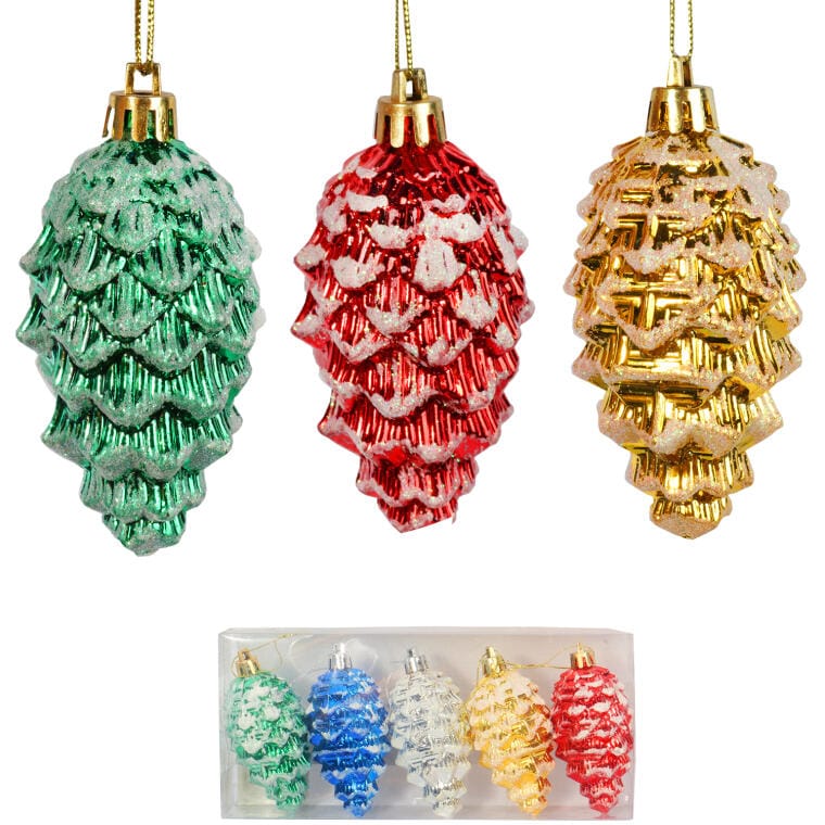 Bombki w kształcie szyszek, dostępne w pięciu kolorach – czerwonym, niebieskim, srebrnym, zielonym i złotym – z brokatowym dekorem, to idealny sposób na elegancką i stylową dekorację bożonarodzeniowego drzewka. Dzięki swojej wyjątkowej formie i błyszczącemu wykończeniu, bombki te przyciągają wzrok i tworzą niepowtarzalną, świąteczną atmosferę, wypełniając wnętrze aurą radosnych, rodzinnych chwil. Wykonane z wysokiej jakości plastiku, cechują się trwałością i odpornością na uszkodzenia, stanowiąc doskonałą alternatywę dla delikatnych, szklanych ozdób. Precyzyjne wykonanie i staranne wykończenie sprawiają, że te bombki będą ozdobą choinki przez wiele lat. Wysokość bombek to 6 cm, a w zestawie znajduje się 5 sztuk.