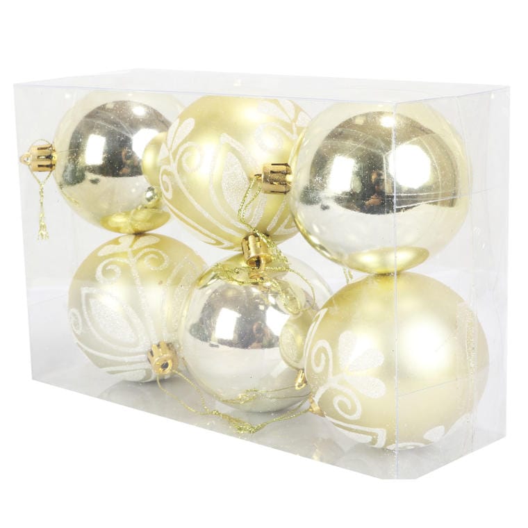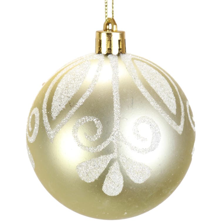 Zestaw 6 Kremowych Bombek Plastikowych 7 cm – Połyskujących i Matowych z Dekorem Brokatowym