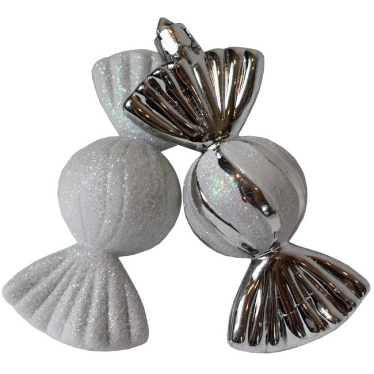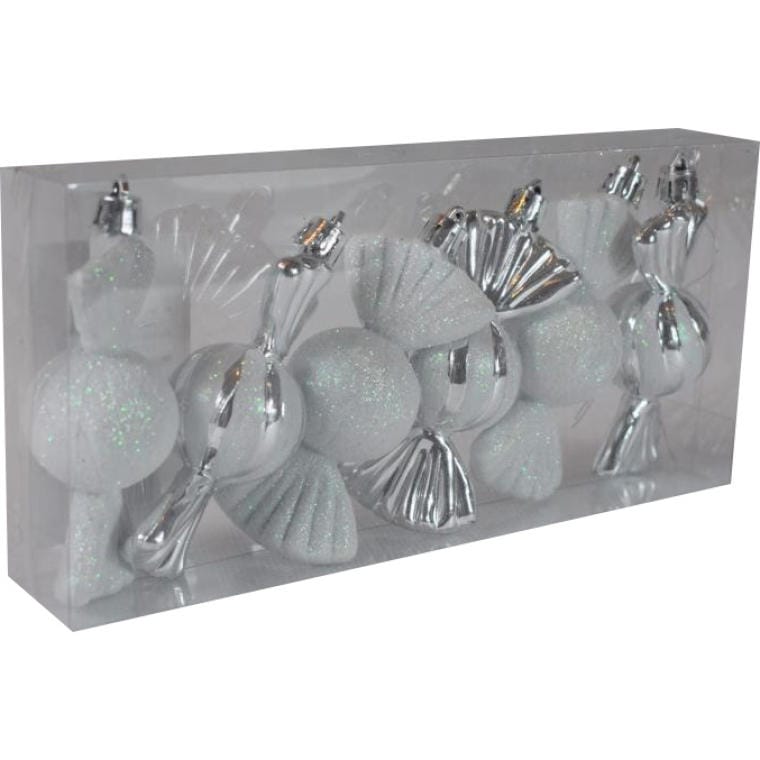Zestaw 6 Srebrnych Bombek w Kształcie Cukierków z Brokatem