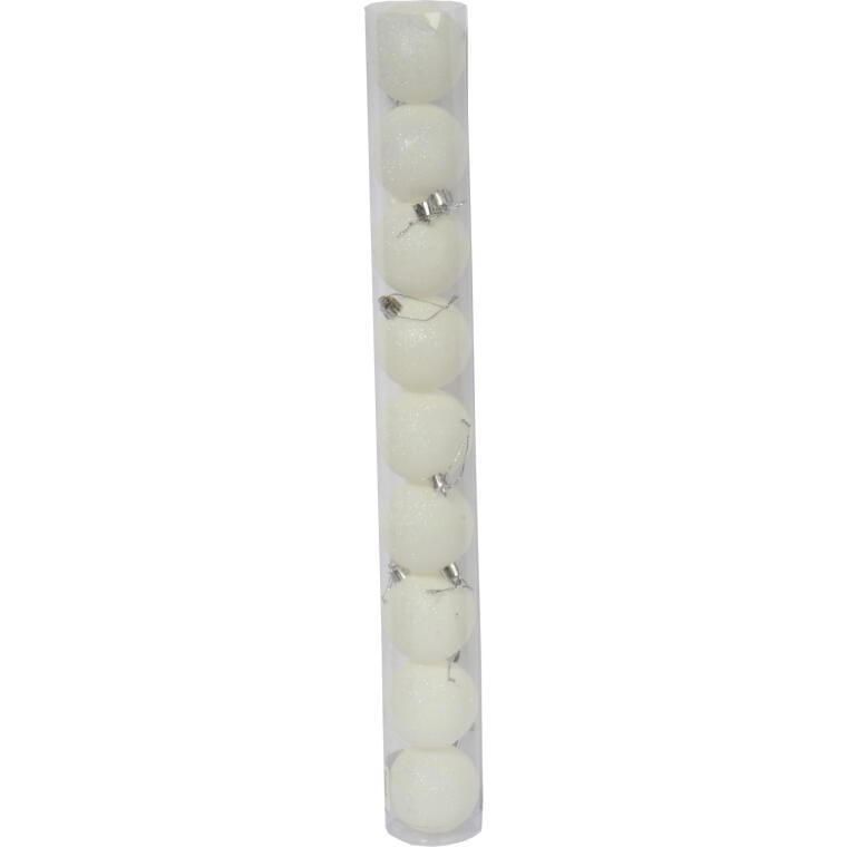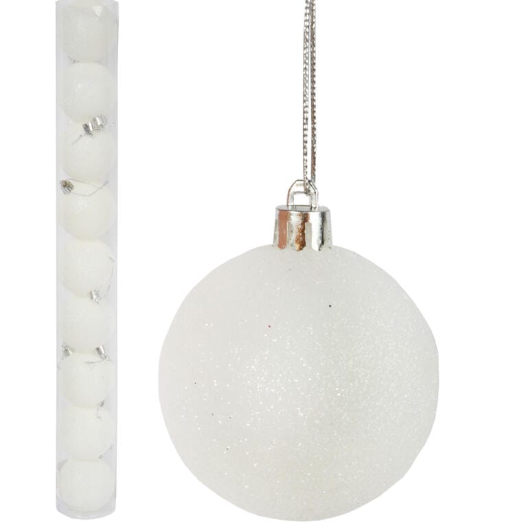 Zestaw 9 Białych Bombek Bożonarodzeniowych z Brokatem, Plastikowych, 6 cm