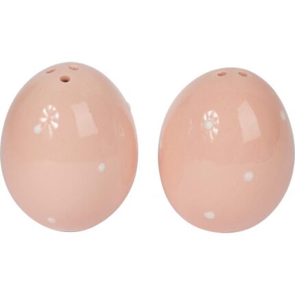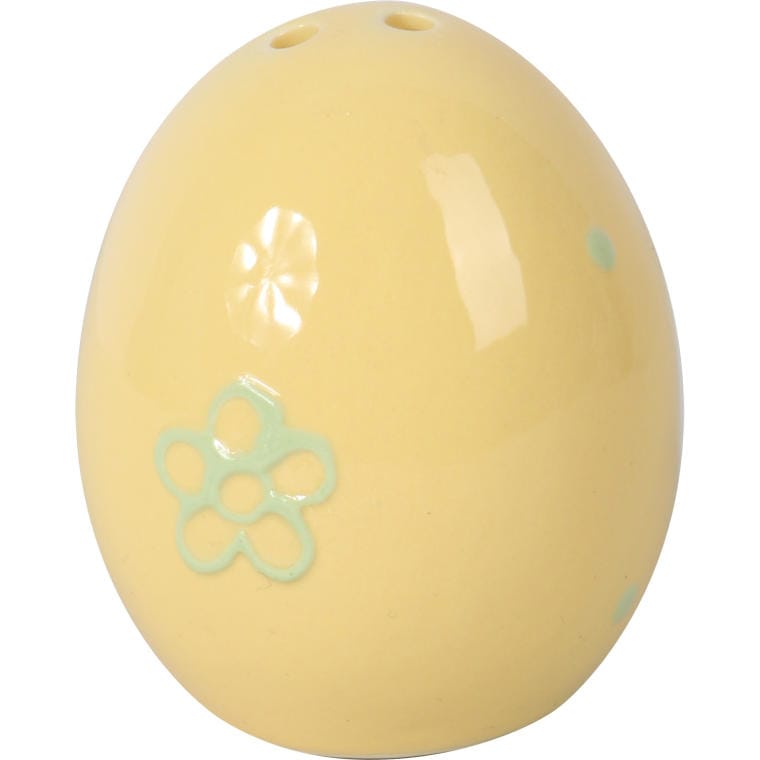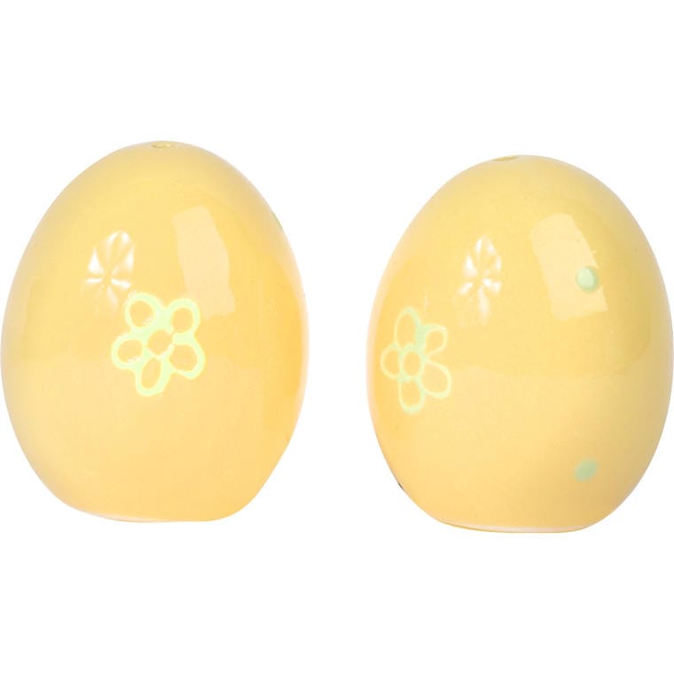 Zestaw 2 ceramicznych jajek do pieprzu i soli to wyjątkowy, pełen uroku element dekoracyjny, który doskonale wkomponuje się w świąteczny stół. Wykonane z wysokiej jakości ceramiki, jajka w kolorze żółtym ozdobione są subtelnymi zielonymi kwiatkami, nadając im elegancki i oryginalny charakter. To nie tylko praktyczny dodatek do codziennego użytku, ale także piękna ozdoba, która wprowadzi ciepły, wiosenny klimat do każdej kuchni czy jadalni. Doskonale sprawdzą się również jako gustowny prezent na święta. Wymiary: 5.5×4.5 cm.