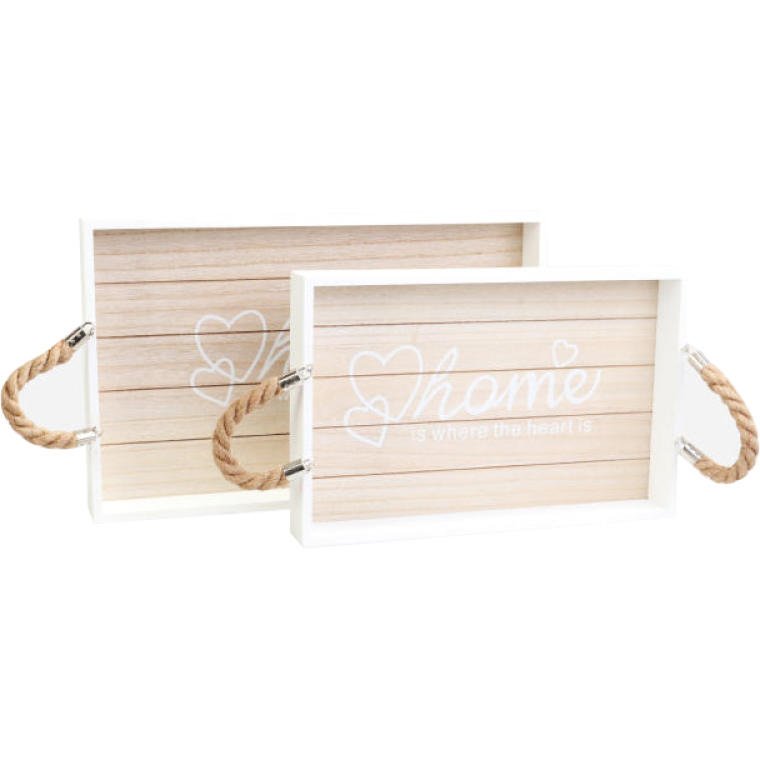 Oryginalny i niepowtarzalny zestaw dwóch tacek to must-have w każdym domu. Te stylowe tace w dwóch rozmiarach uczynią każde śniadanie do łóżka jeszcze bardziej wyjątkowym doświadczeniem. Nowoczesny design wzbogacony sznurami gwarantuje pewny uchwyt, a motyw dekoracyjny na każdej z tac idealnie wpisuje się w najnowsze trendy.