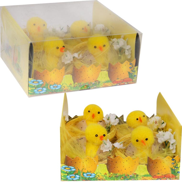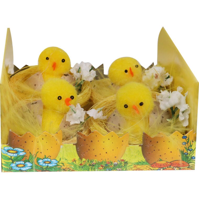 Zestaw Wielkanocnych Kurczaczków w Skorupkach z Kwiatkami i Siankiem – 4 Sztuki